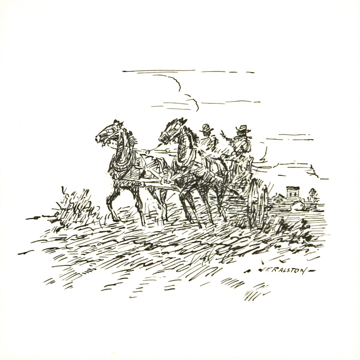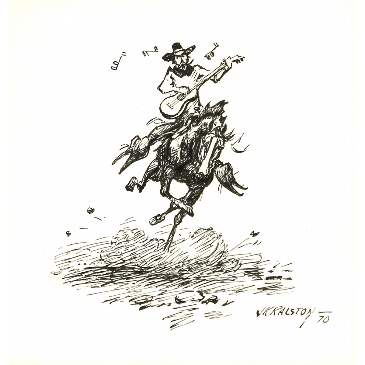 James Kenneth Ralston (1896 - 1987). Three pen and ink drawings: Cowboys and Buggy, 5.75" x 5.75", signed lower right: J K RALSTON. Ragtime Cowboy Joe, 6" x 5.5" pen and ink, signed lower right: J K RALSTON - 70, label verso states Cowboy and Western Songs by Austin and Alta Fife. Drawing for a song of the same name. From the collection of Marjorie and Charles Walter, Missoula, MT. The Grand Roundup, 6.25" x 5.75", signed lower right: J K RALSTON, label verso states Cowboy and Western Songs by Austin and Alta Fife. Drawing for section on "The Cowboy's Dream". From the collection of Marjorie and Charles Walter, Missoula, MT.