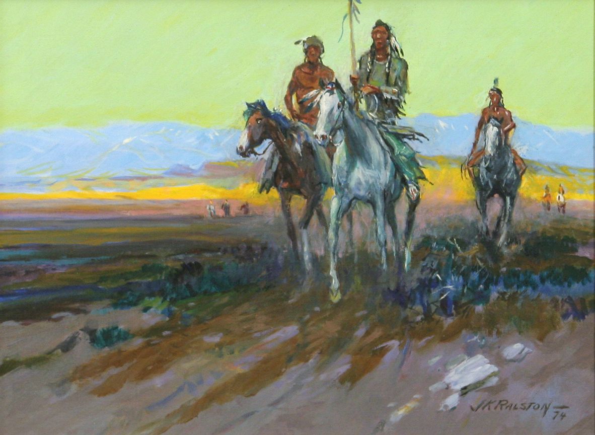 James Kenneth Ralston (1896 - 1987). Warrior Of The Plains. 12" x 16" oil on board. Signed lower right: J. K. RALSTON -74. Condition reports can be viewed at www.marchinmontana.com/docs/2013CR.pdf