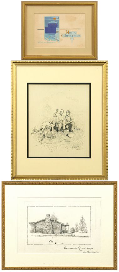 James Kenneth Ralston (1896 - 1987). Three works: Merry Christmas. 6" x 9" serigraph. Printed: Willo and Kenneth. Ralston's Relatives. 13" x 11" pen & ink. Signed lower right: J K Ralston. Season's Greetings. 10" x 15" pen & ink. Inscribed: from the RALSTONS. Condition reports can be viewed at www.marchinmontana.com/docs/2013CR.pdf