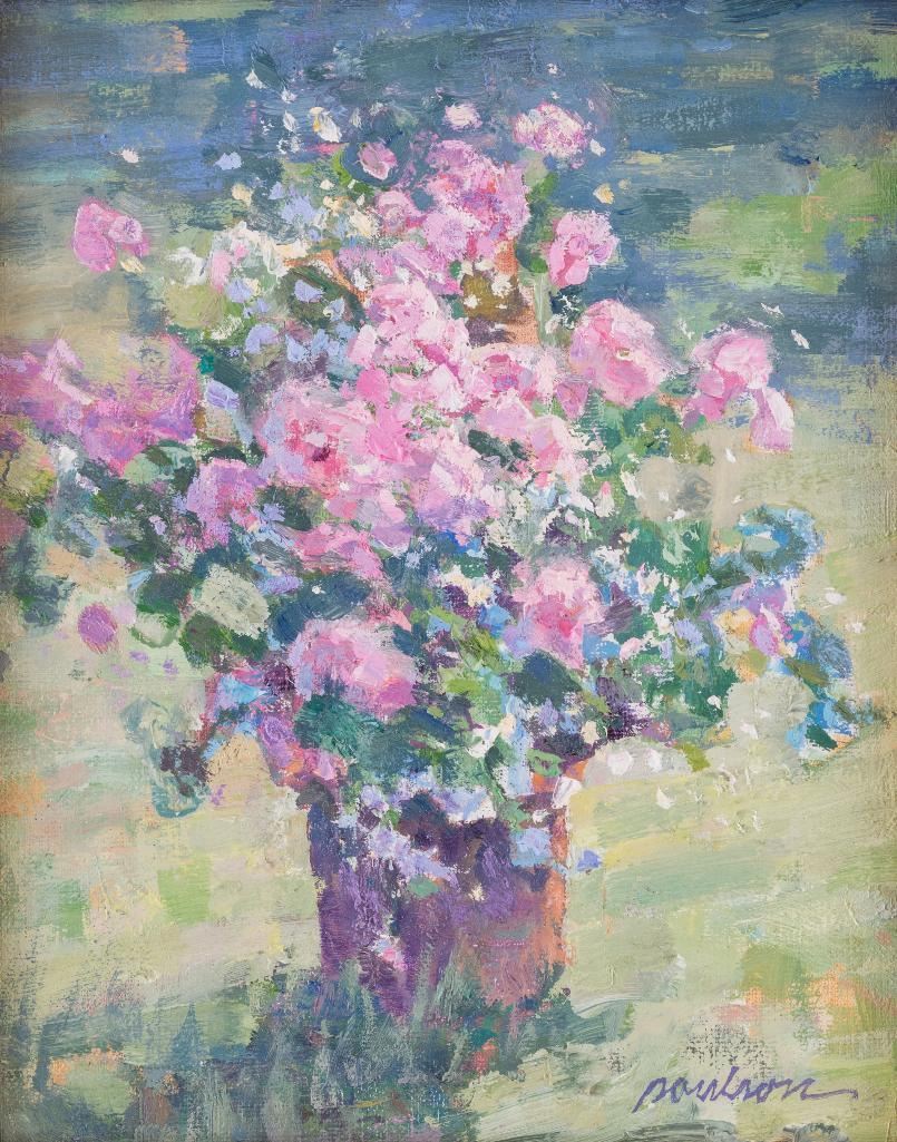 James Poulson (1955 - ) Three oils: 1) Snow in the Shadows 18" x 12" oil on canvasboard Signed lower right Verso: Titled and signed. 2) My Backyard 11" x 14" oil on canvasboard Signed lower right Verso: Titled and signed. 3) Backyard Bouquet 10" x 8" oil on board Signed lower right Verso: Titled and signed. $1,500-2,500