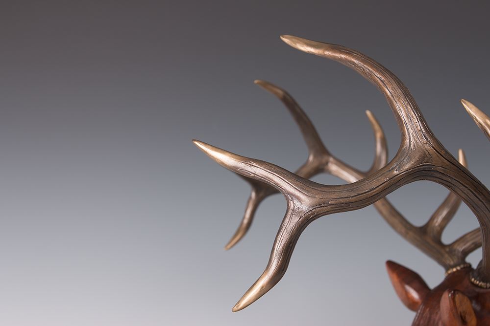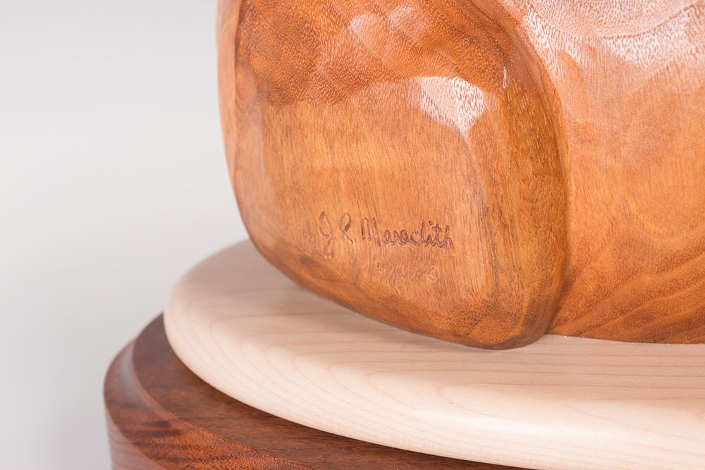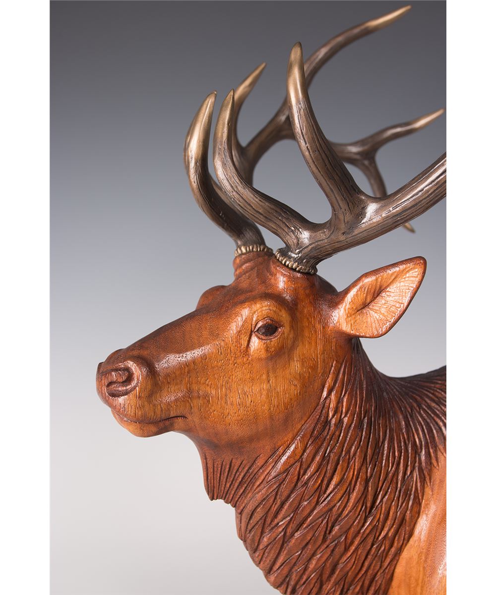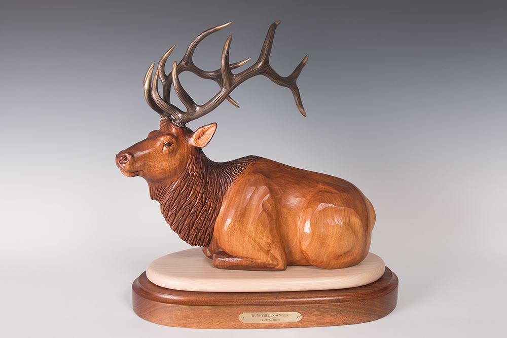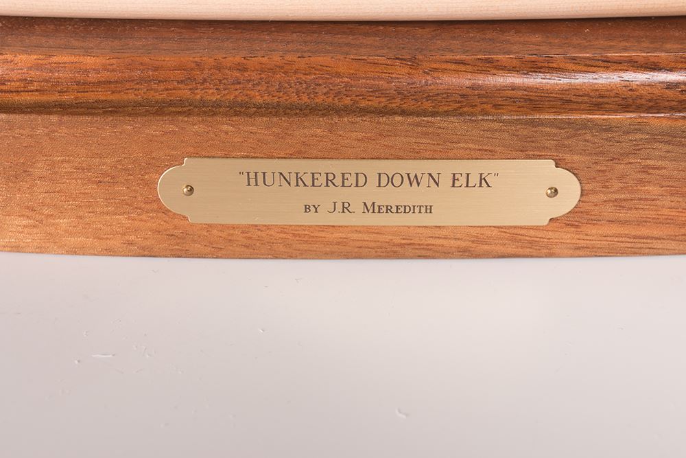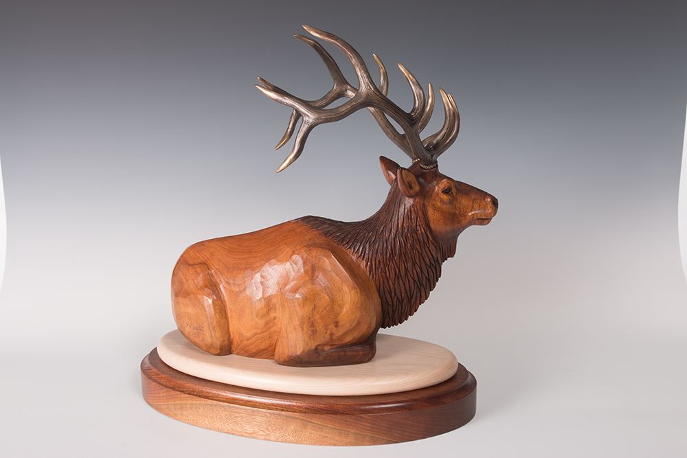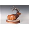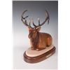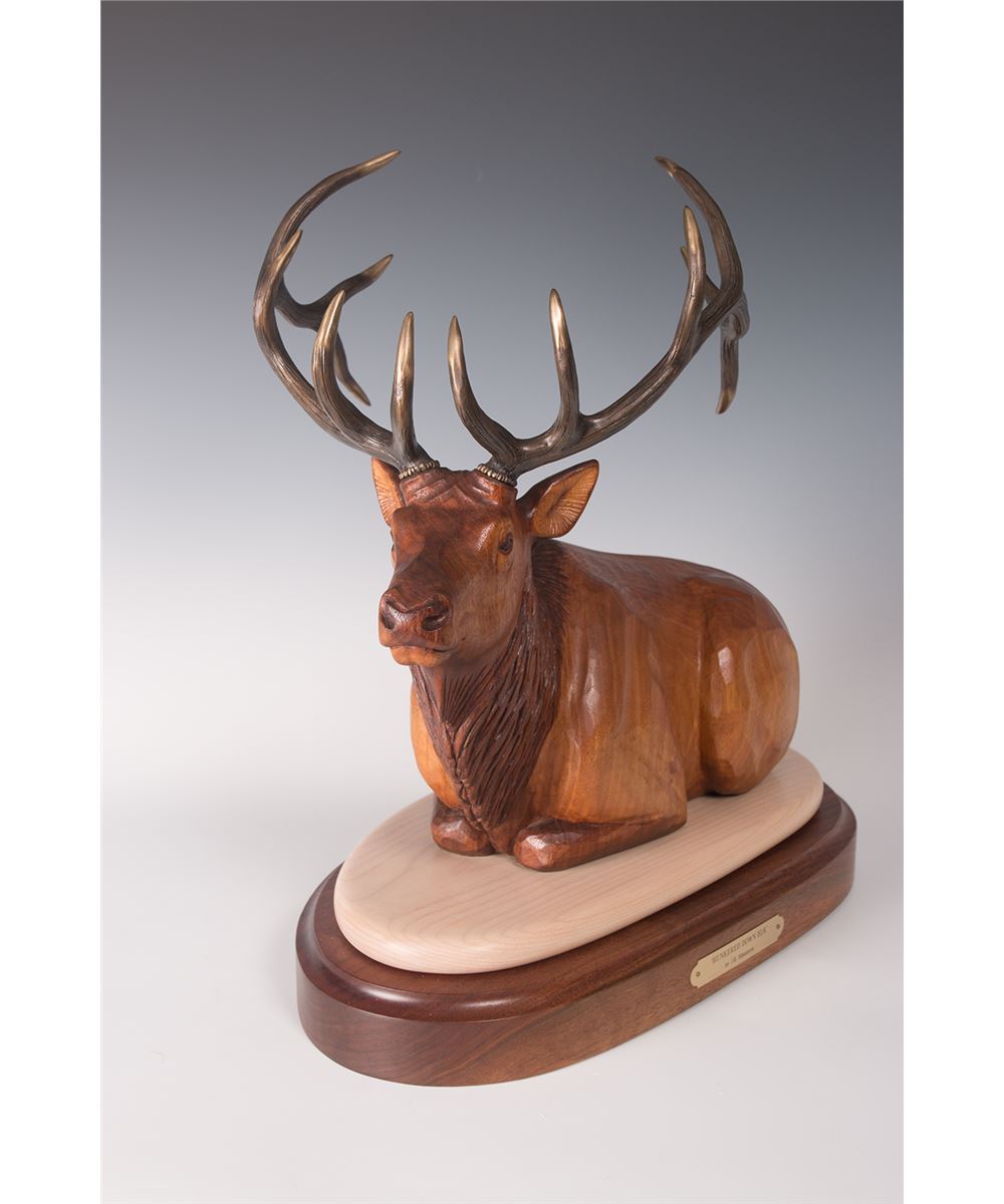 James R. Meredith. Hunkered Down Elk. 15" x 16" x 9.5" woodcarving with bronze antlers. Inscribed: J R Meredith