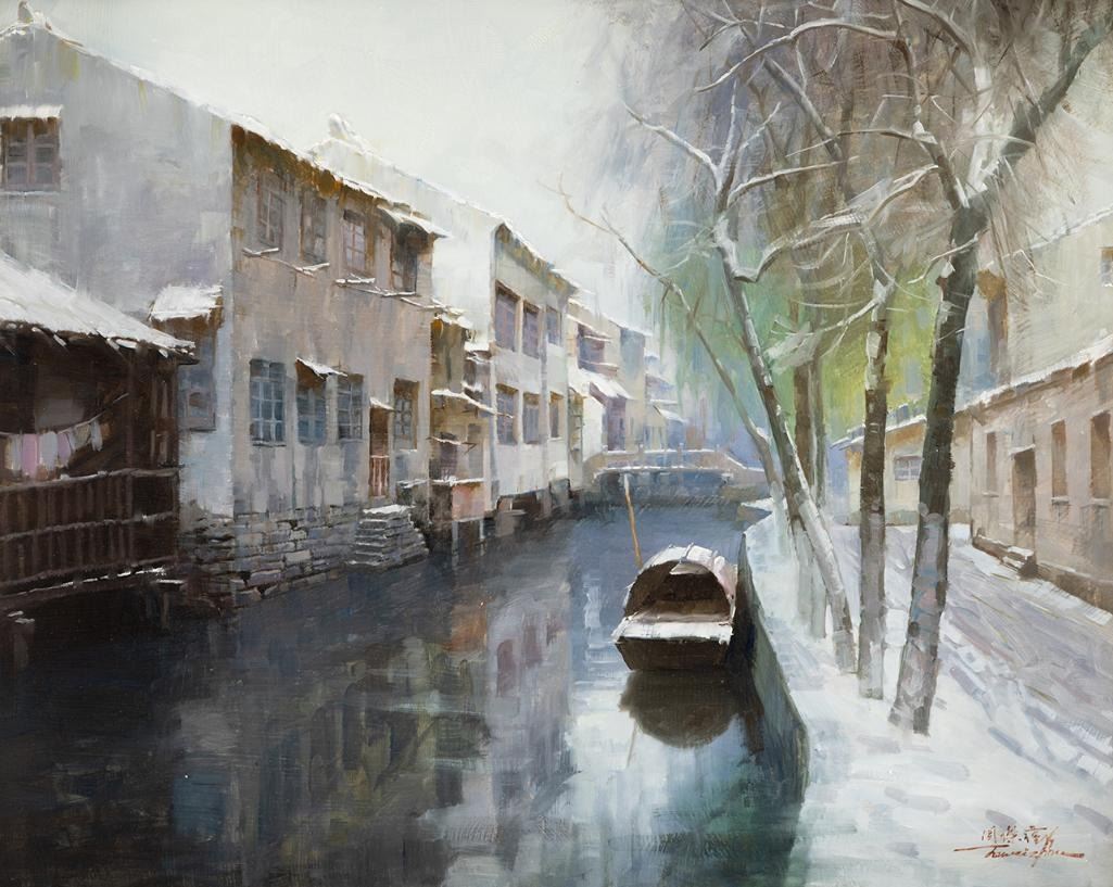 Jie Wei Zhou (b. 1962) Winter Reflections - Suzhou 16" x 20" oil on board Signed lower right $800-1,000
