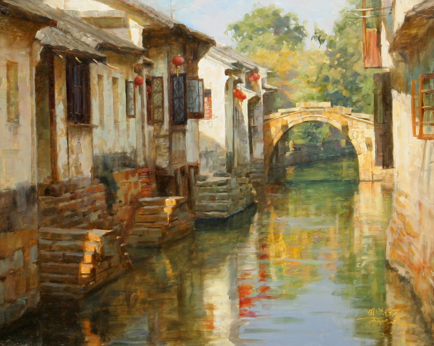Jie Wei Zhou (b. 1962). Suzhou Canal. 16" x 20" oil on canvas. signed lower right. (est $4,000-5,000) Condition Report: Black lights clean. Nicely framed