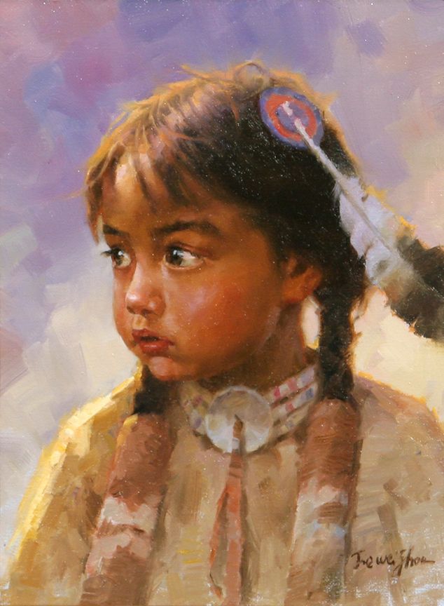 Jie Wei Zhou (1962 - ). First Feather. 12" x 9" oil on canvas. Signed lower right: Jie Wei Zhou. Condition reports can be viewed at www.marchinmontana.com/docs/2013CR.pdf