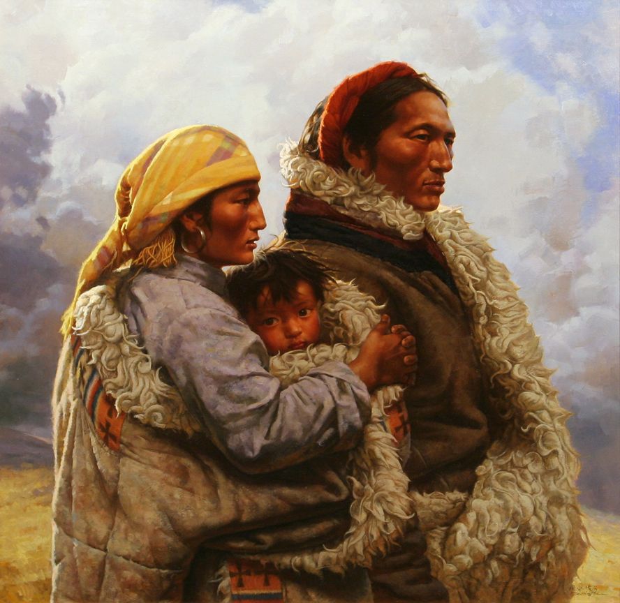 Jie Wei Zhou (1962 - ). Tibetan Family. 30" x 30" oil on canvas. Signed lower right: Jie Wei Zhou . Condition reports can be viewed at www.marchinmontana.com/docs/2013CR.pdf
