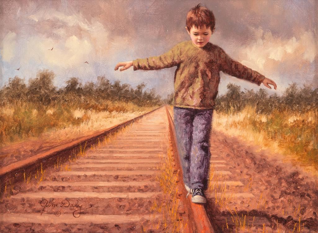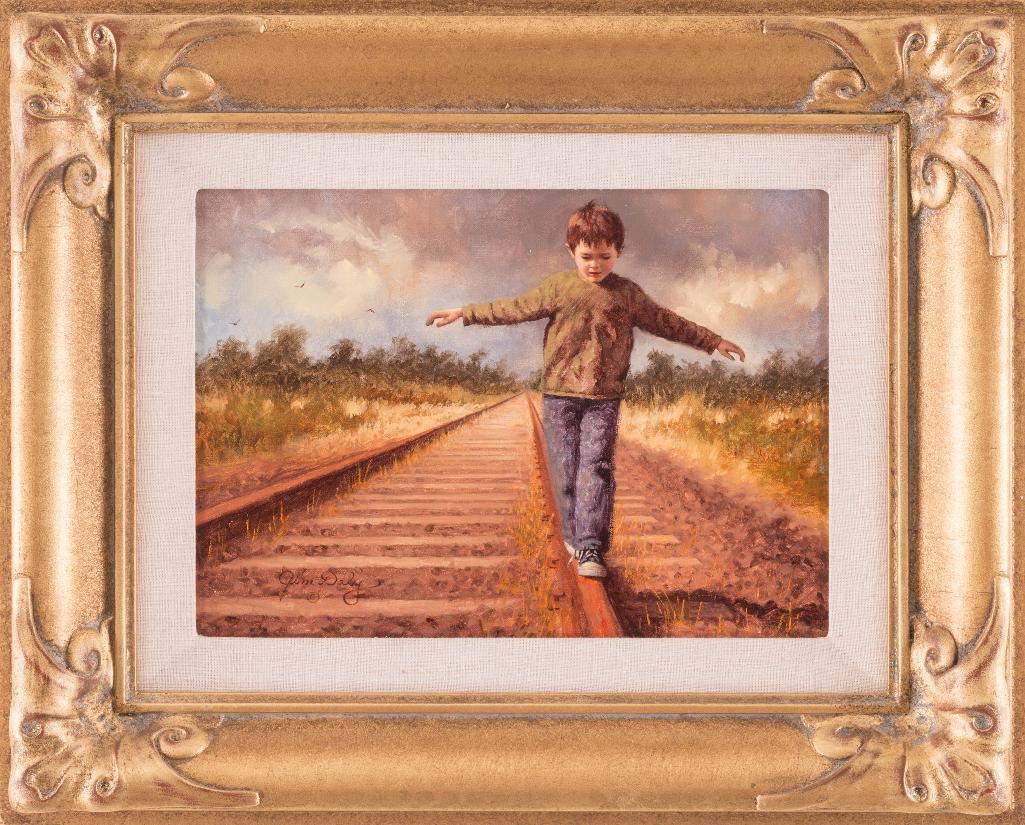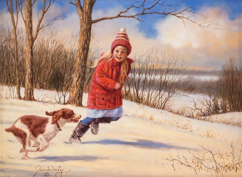Jim Daly (1940 - ) Three oils: 1) Balancing Act 9" x 12" oil on canvasboard Signed lower left Verso: Titled and signed. 2) The Treasure Box 8" x 10" oil on canvasboard Signed lower right Verso: Titled, signed and dated 2012. 3) Winter Romp 9" x 12" oil on canvasboard Signed lower left Verso: Titled and signed. $1,000-1,500