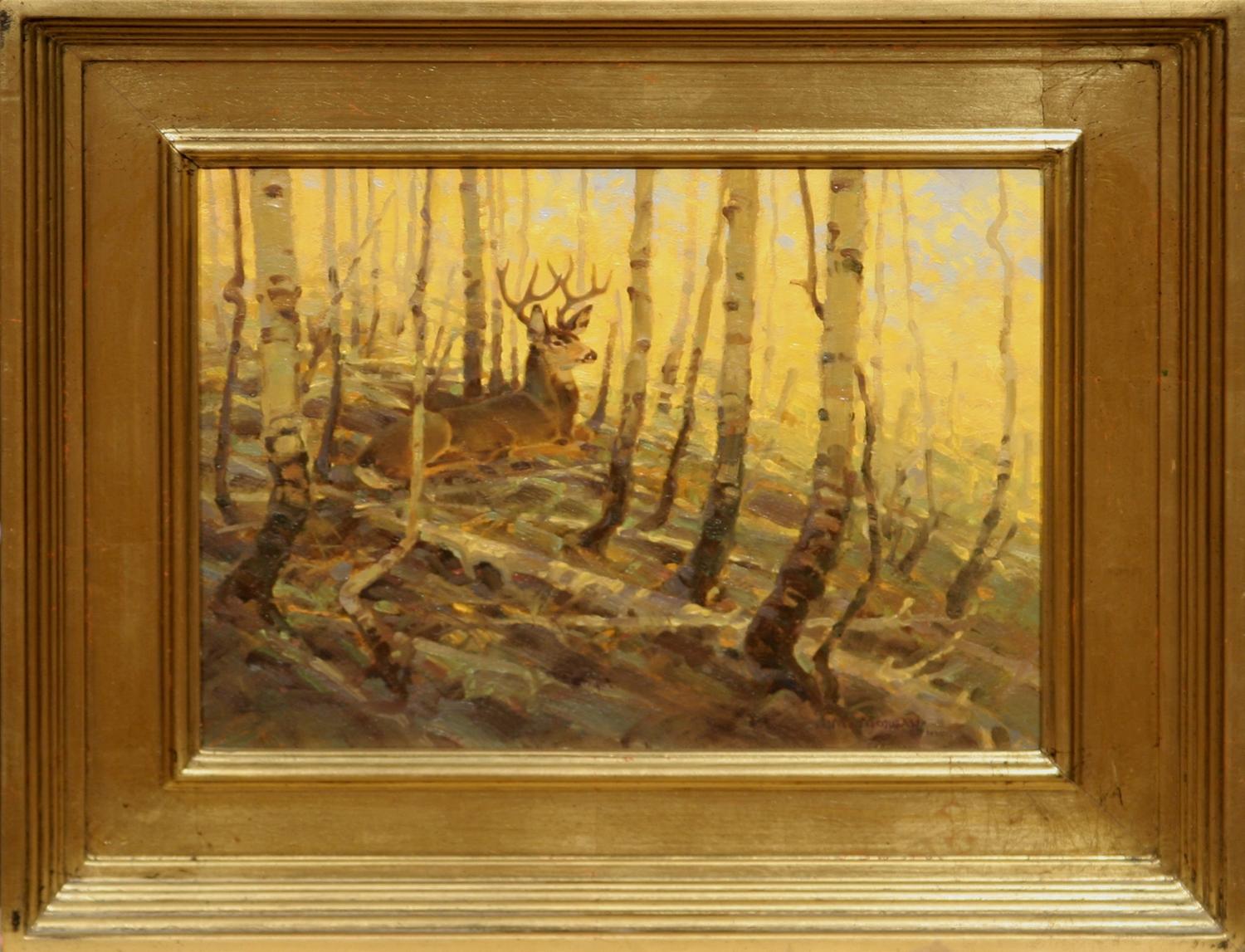 Jim Morgan (b. 1947). Resting In The Aspens. 9" x 12" oil on board. signed lower right. (est $800-$1,200). Provenance: National Museum of Wildlife Art, Jackson, WY. Condition Report: Black lights clean. In nice gold frame