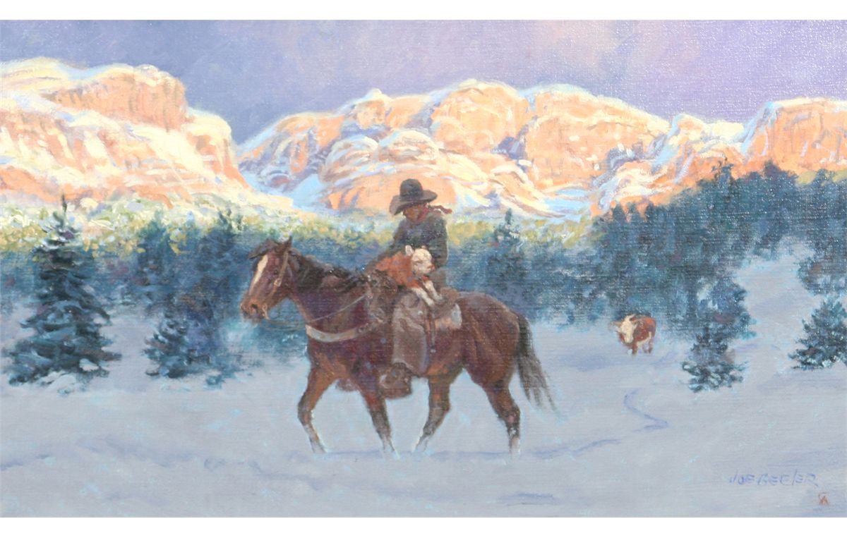 Joe Beeler (1931 - 2006) CA. Good Samaritan. 12" x 20" oil on canvas. Signed lower right: JOE BEELER CA. Condition reports can be viewed at www.marchinmontana.com/docs/2013CR.pdf