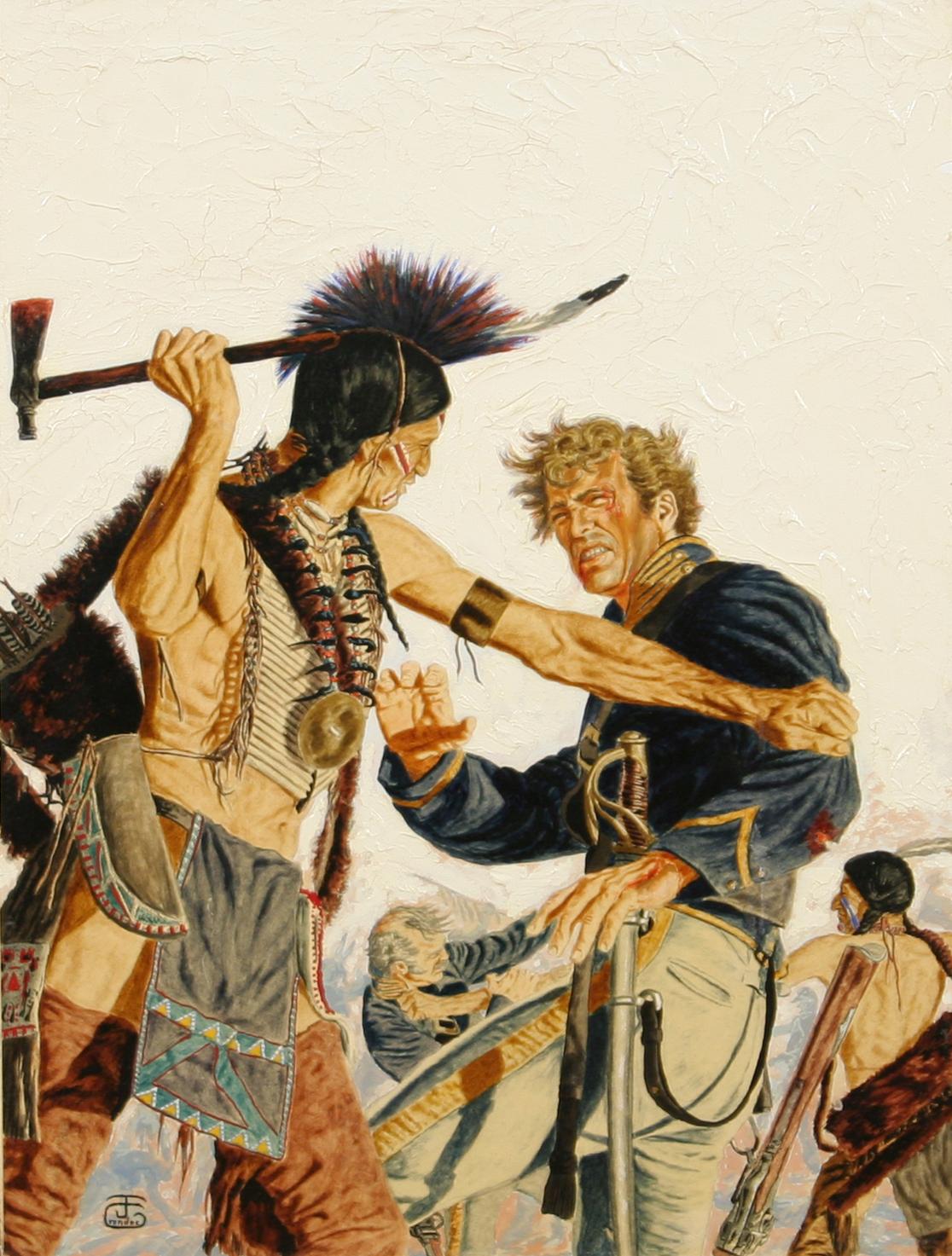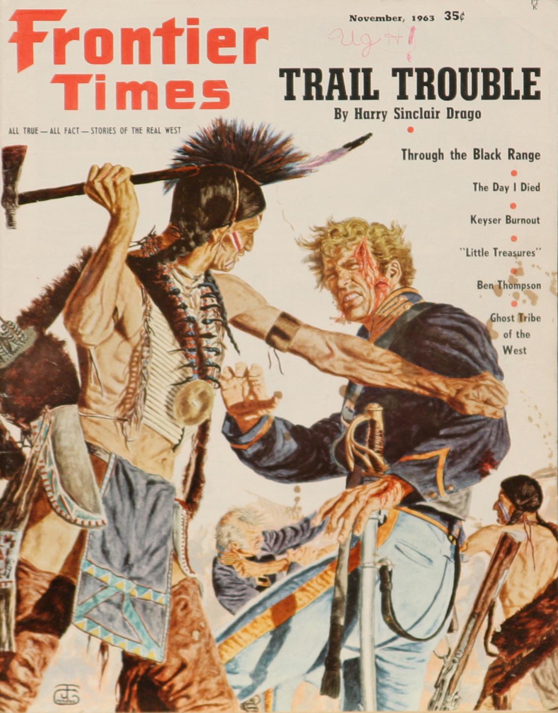 Joe Grandee (b. 1929). Cover Illustration for Frontier Times, Nov 1963. 24" x 18" oil on board. signed lower left. Copy of the magazine is included. (est $3,000-$4,000) Condition Report: Black lights clean