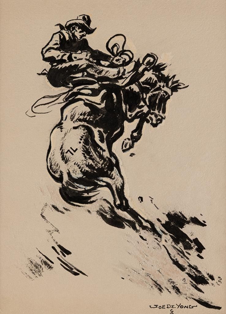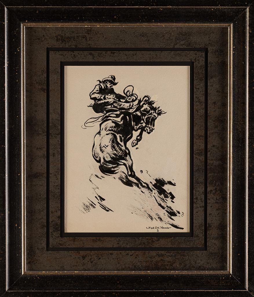 The bucking bronco is an iconic subject in Western art, symbolizing the rugged spirit, resilience, and freedom of the American West. Often depicted with a cowboy struggling to stay atop a wildly bucking horse, this image captures the raw energy and untamed nature of both the animal and the landscape. The bronc represents the challenges of frontier life, where man and beast must contend with each other and the unforgiving wilderness. Artists like Charles M. Russell and Frederic Remington popularized this theme, using dynamic brushwork and vivid detail to convey motion and struggle. The bucking bronc has since become a cultural emblem of the West, celebrating the courage, skill, and determination of cowboys while evoking nostalgia for a time when the American frontier was vast and untamed. This imagery continues to resonate, appearing in rodeo posters, sculptures, and paintings, reflecting the enduring legacy of Western heritage and values.