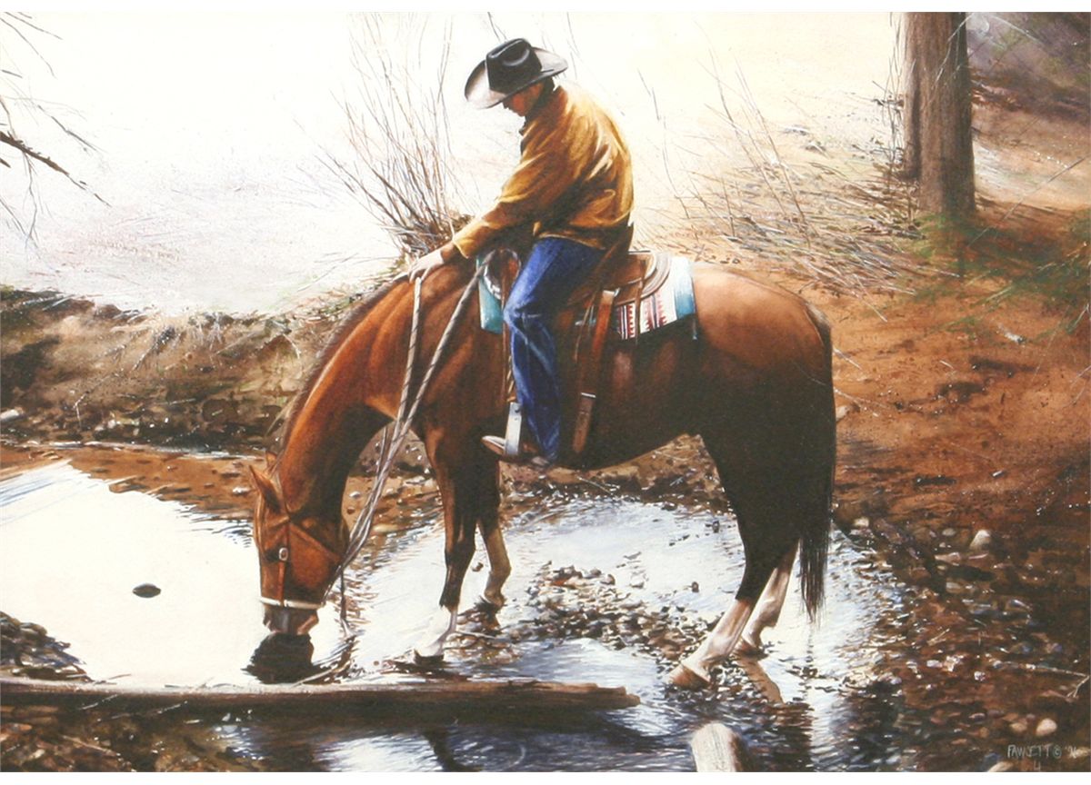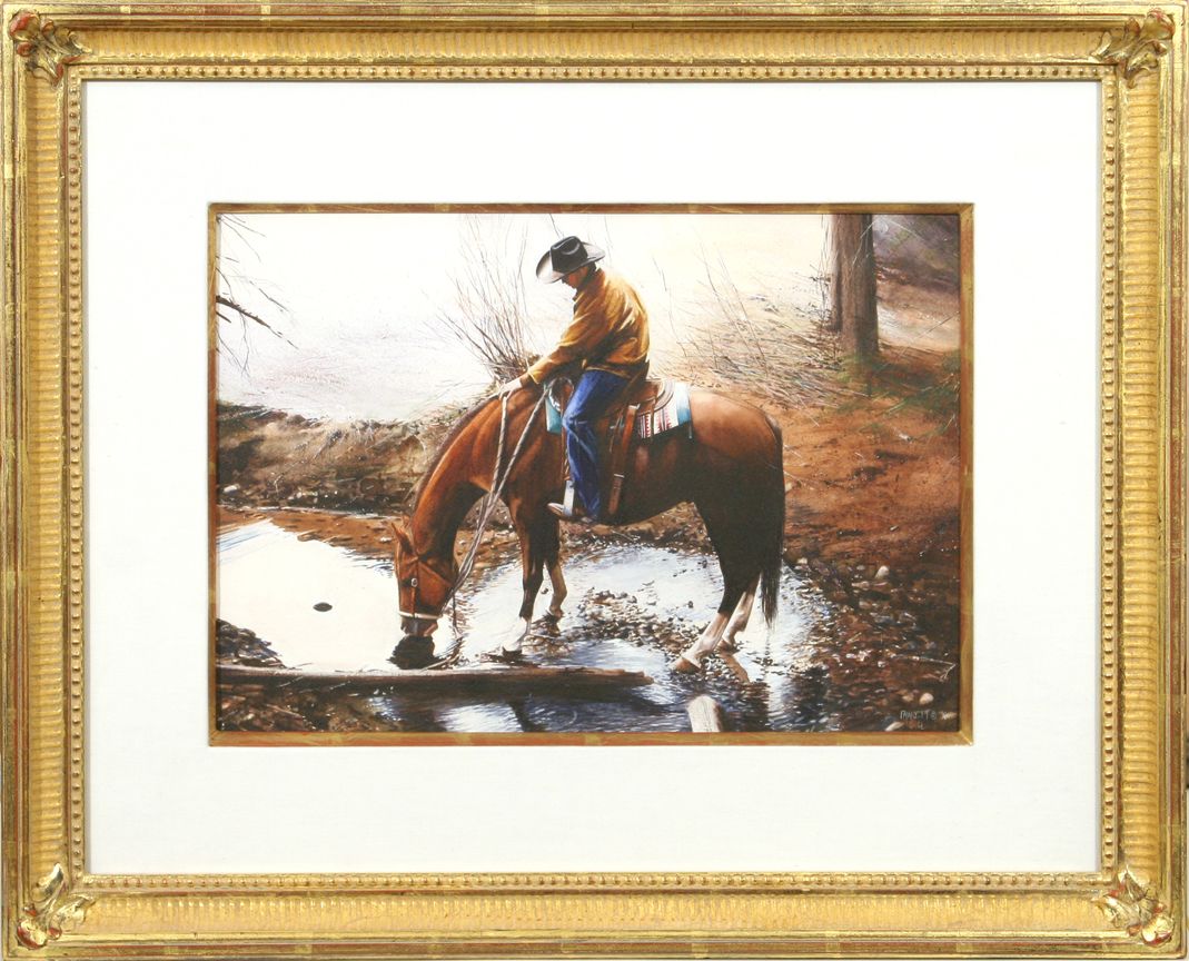 John Fawcett (1952 - ). At The Waterhole. 12" x 17" watercolor. Signed lower left: FAWCETT © '96 LL. Provenance: Zoo Montana, Billings, MT. Condition reports can be viewed at www.marchinmontana.com/docs/2013CR.pdf