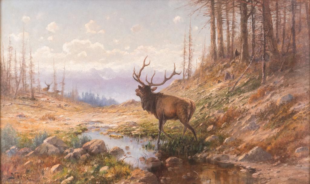 John Fery (1859-1934) Bugling Elk 27.75" x 48" oil on board Signed lower left $30,000-40,000