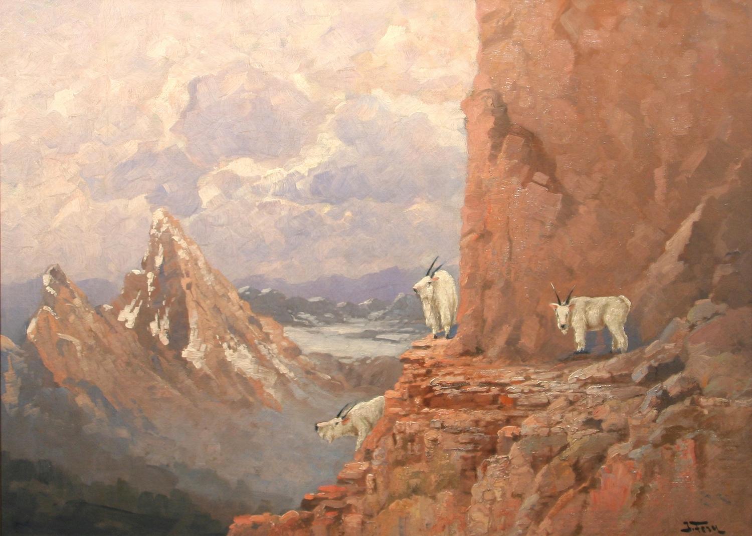 John Fery (1859-1934). Glacier Park Goats. 35 ½" x 47" oil on canvas. signed lower right. (est $10,000-15,000) Condition Report: Black lights clean. Gold frame is in fine condition