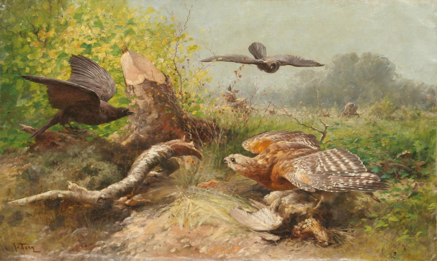 John Fery (1859-1934). Redtail Hawk. 17" x 27" oil on canvas. signed lower left. (est $6,000-9,000) Condition Report: Has been professionally restored with a 1" patch (visible on back). Not visible from front. In nice gold frame
