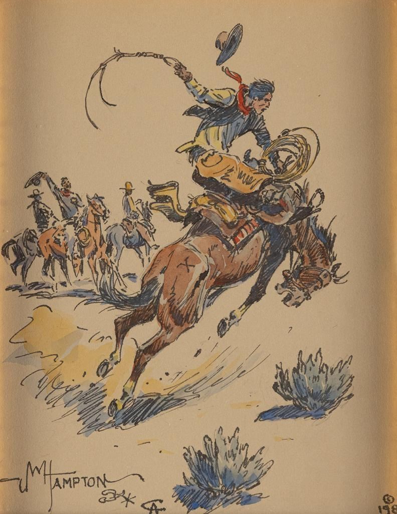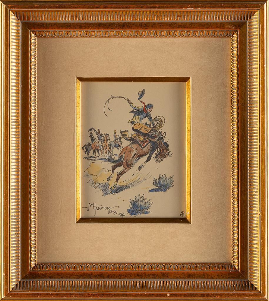 The bucking bronco is an iconic subject in Western art, symbolizing the rugged spirit, resilience, and freedom of the American West. Often depicted with a cowboy struggling to stay atop a wildly bucking horse, this image captures the raw energy and untamed nature of both the animal and the landscape. The bronc represents the challenges of frontier life, where man and beast must contend with each other and the unforgiving wilderness. Artists like Charles M. Russell and Frederic Remington popularized this theme, using dynamic brushwork and vivid detail to convey motion and struggle. The bucking bronc has since become a cultural emblem of the West, celebrating the courage, skill, and determination of cowboys while evoking nostalgia for a time when the American frontier was vast and untamed. This imagery continues to resonate, appearing in rodeo posters, sculptures, and paintings, reflecting the enduring legacy of Western heritage and values.