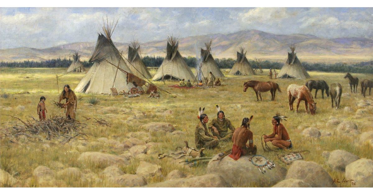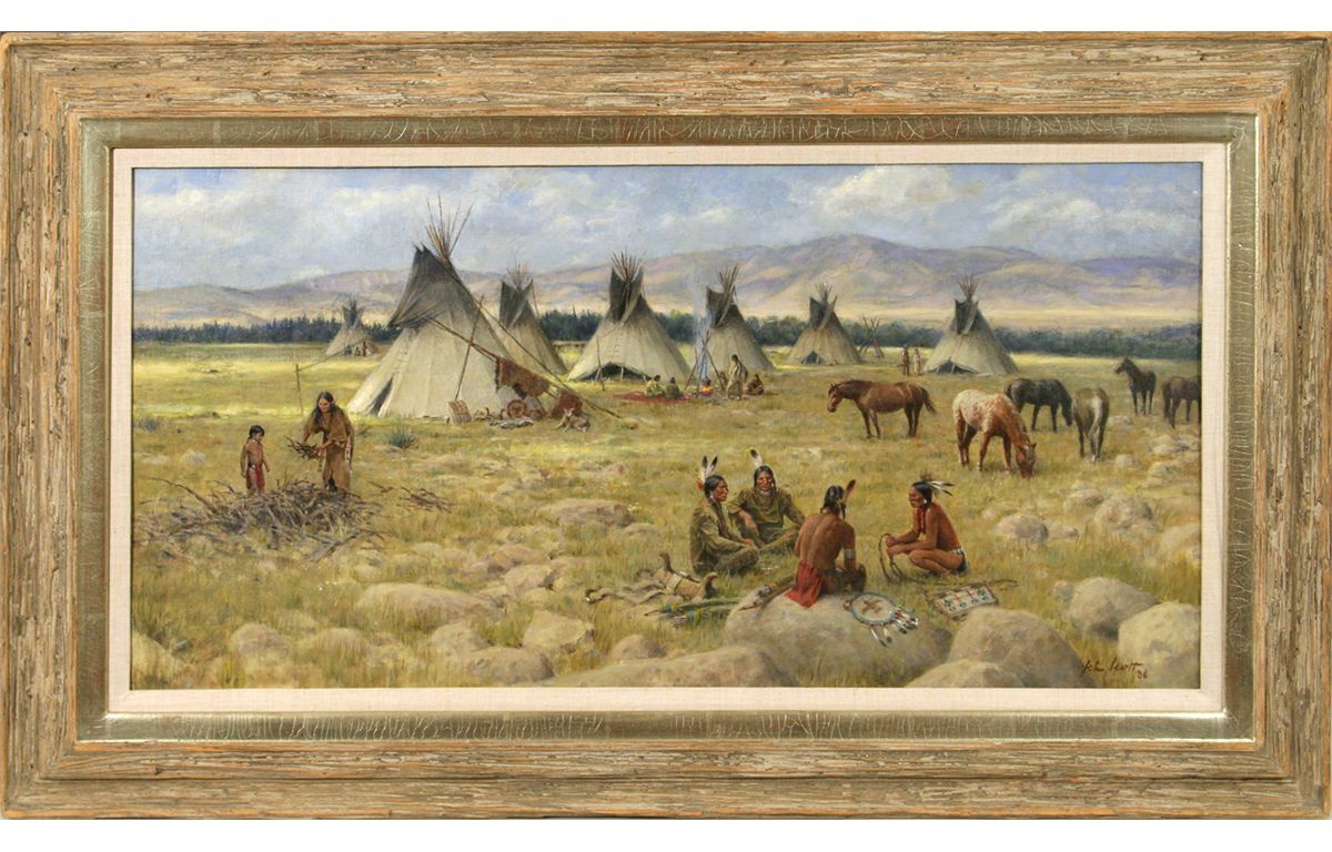 John Walter Scott (1907 - 1987). Indian Encampment. 17" x 34" oil on board. Signed lower right: John Scott '86. Condition reports can be viewed at www.marchinmontana.com/docs/2013CR.pdf