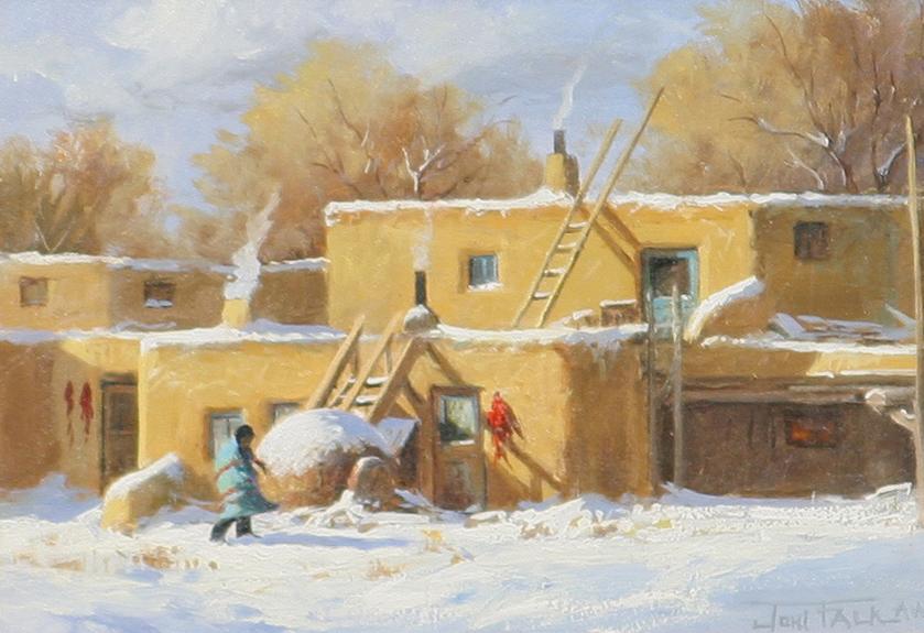 Joni Falk (b. 1933). Sun Glow at Taos. 5" x 7" oil on board. Signed with AWA lower right. (est $500-1,000) Condition Report: Black lights clean. Beautifully framed