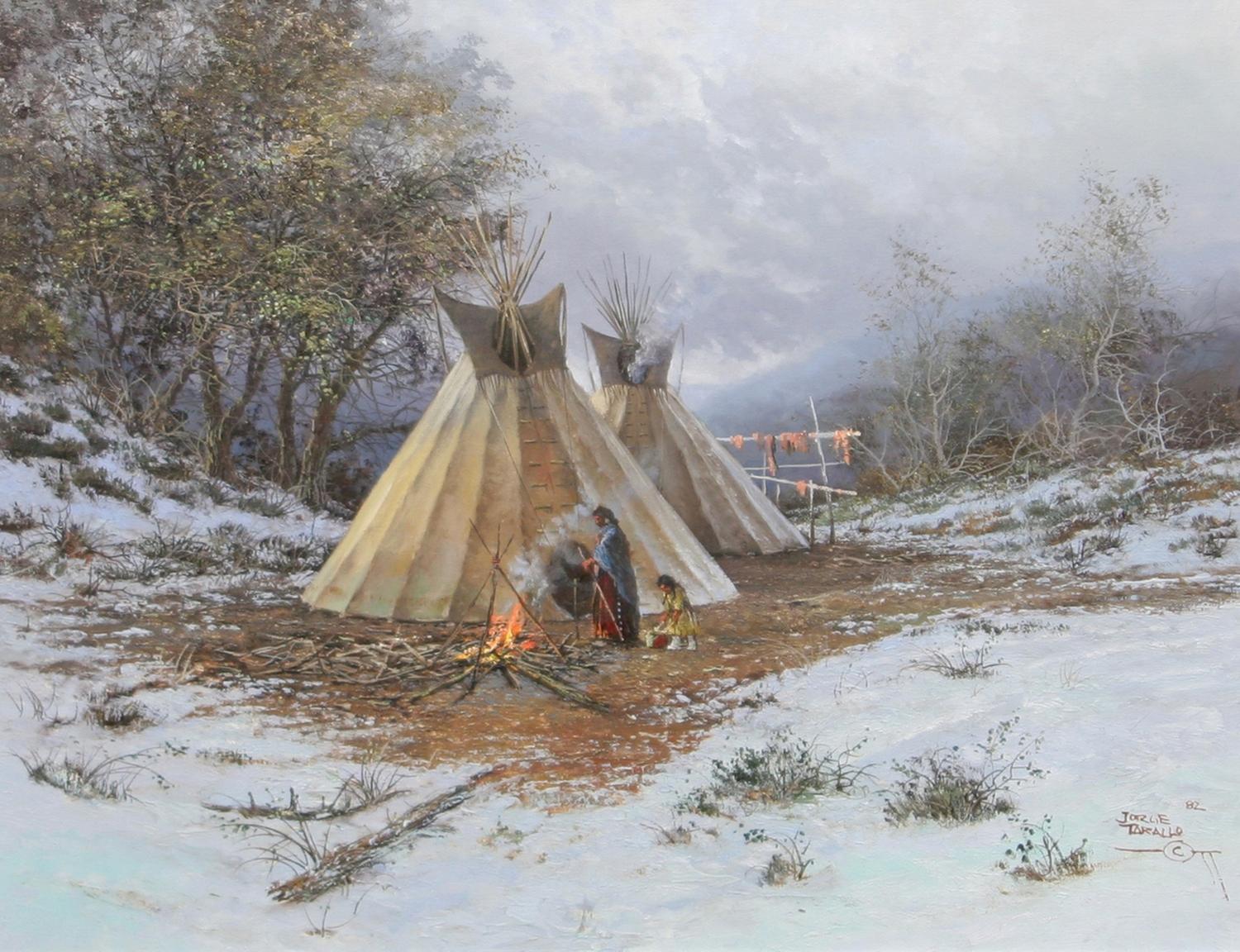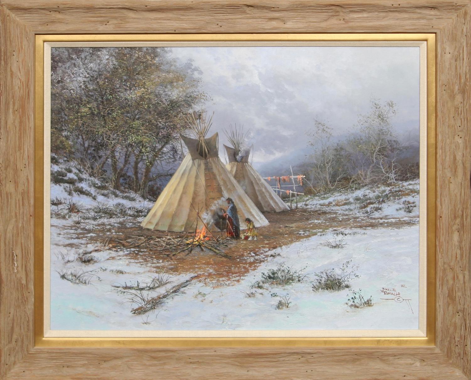 Jorge Tarallo (b. 1951). First Snow. 24" x 30" oil on canvas. signed lower right. (est $1,000-1,500) Condition Report: Black lights clean. In distressed wood frame