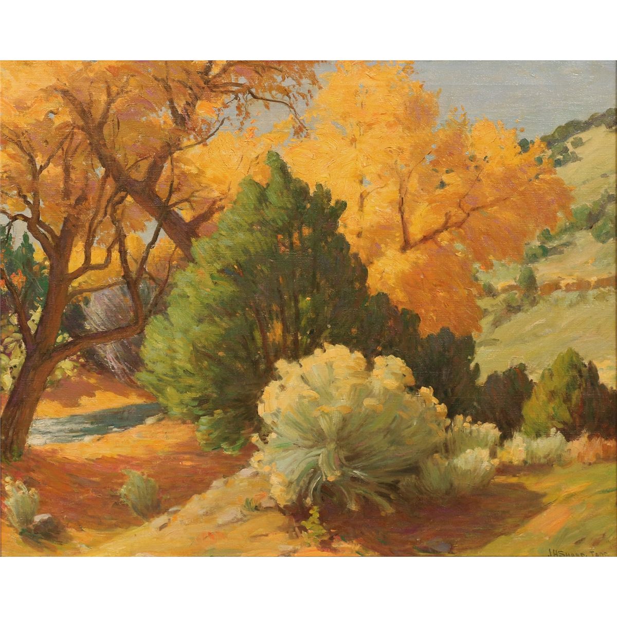 Joseph Henry Sharp (1859 - 1953). Taos Canon, Cottonwood, Sage and Cedars. 25" x 30" oil on canvas. Signed lower right: J H SHARP, TAOS. Verso: titled.