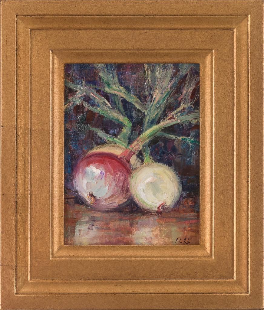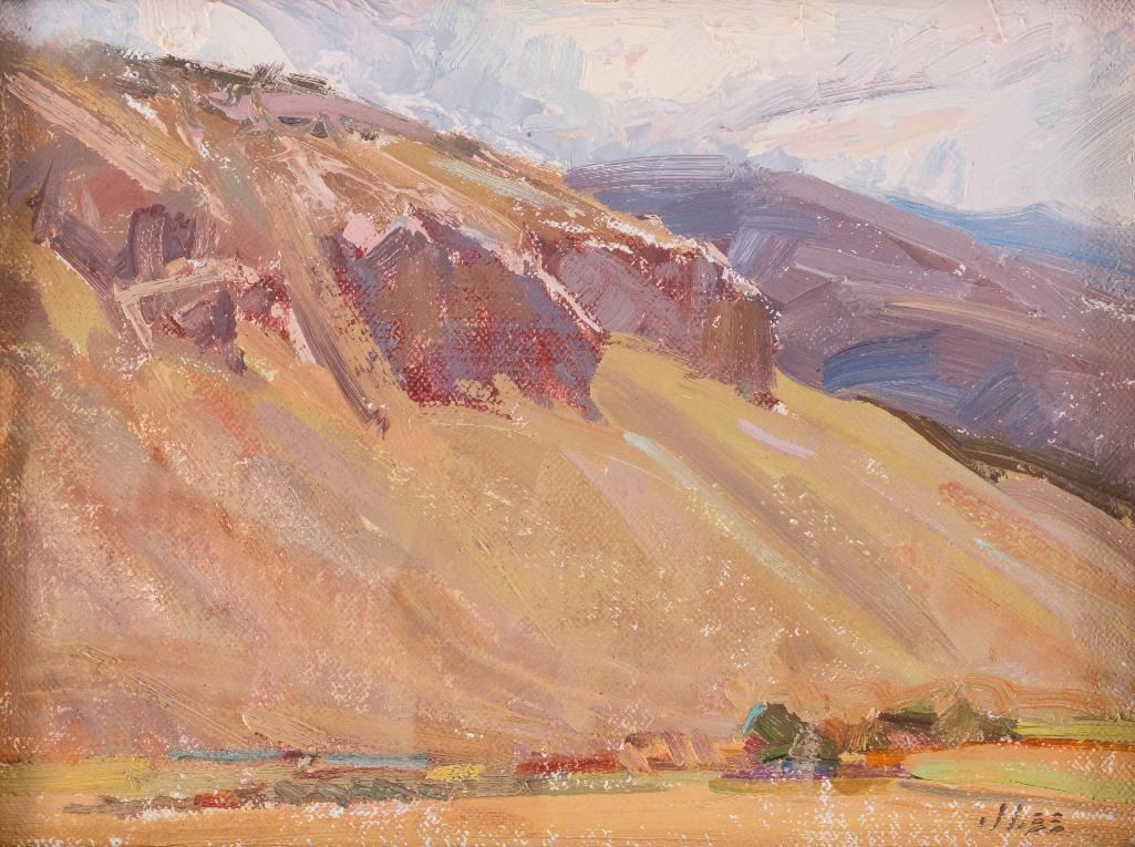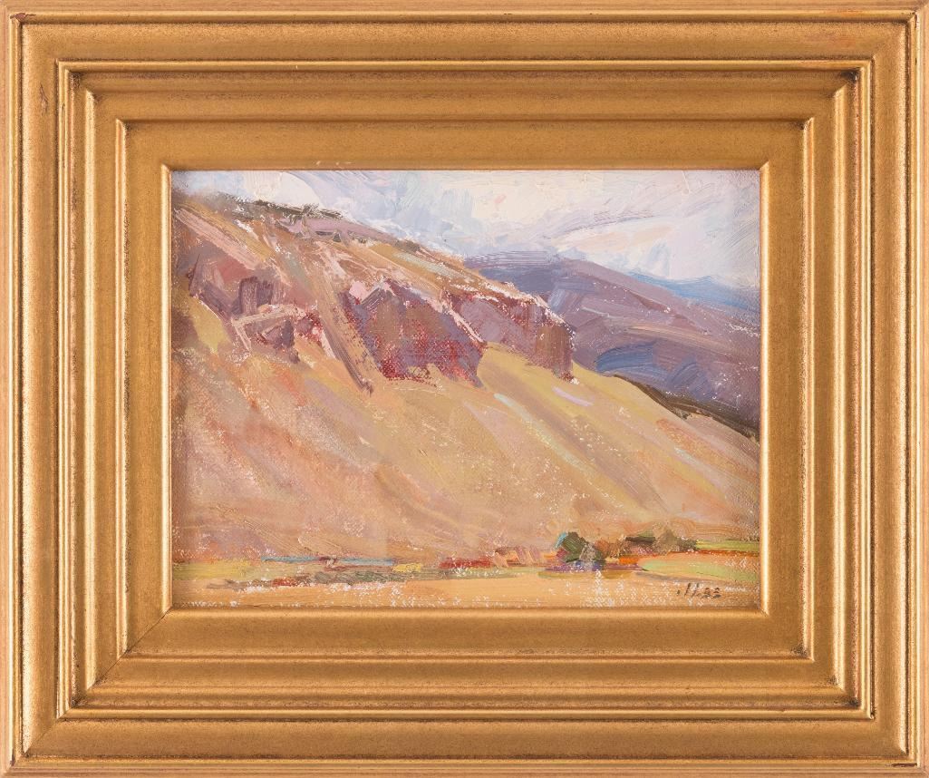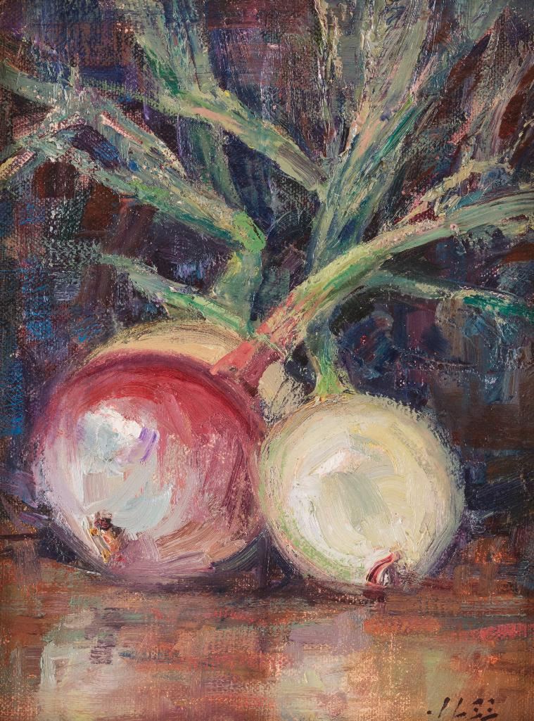 Joyce Lee (1950-2011) Four oils: 1) East of Bridger 12" x 16" oil on board Signed lower right Verso: Titled, signed and dated 2004. 2) Azalea Still-Life 11" x 14" oil on board Signed lower right Verso: Titled, signed and dated 2004. 3) Onions 8" x 6" oil on board Signed lower right Verso: Titled, signed and dated 2004. 4) Cliffs-Eagle County, CO 6" x 8" oil on board Signed lower right Verso: Titled, signed and dated 2005. $1,000-1,500