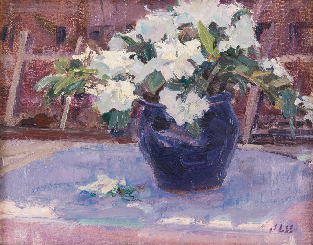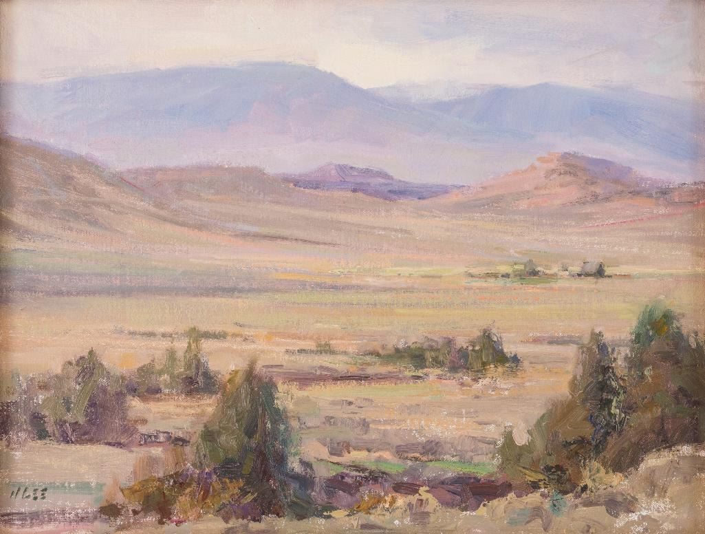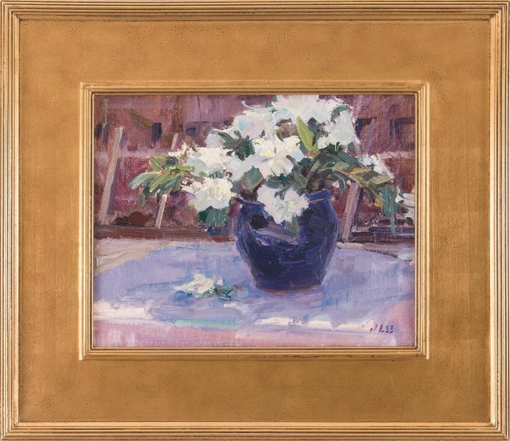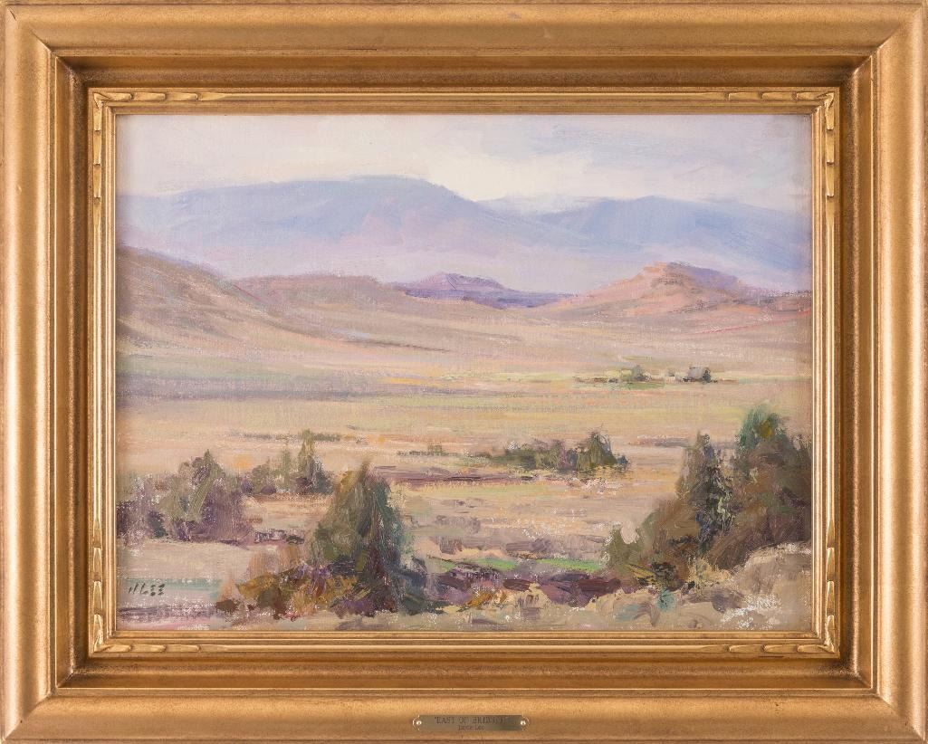 Joyce Lee (1950-2011) Four oils: 1) East of Bridger 12" x 16" oil on board Signed lower right Verso: Titled, signed and dated 2004. 2) Azalea Still-Life 11" x 14" oil on board Signed lower right Verso: Titled, signed and dated 2004. 3) Onions 8" x 6" oil on board Signed lower right Verso: Titled, signed and dated 2004. 4) Cliffs-Eagle County, CO 6" x 8" oil on board Signed lower right Verso: Titled, signed and dated 2005. $1,000-1,500