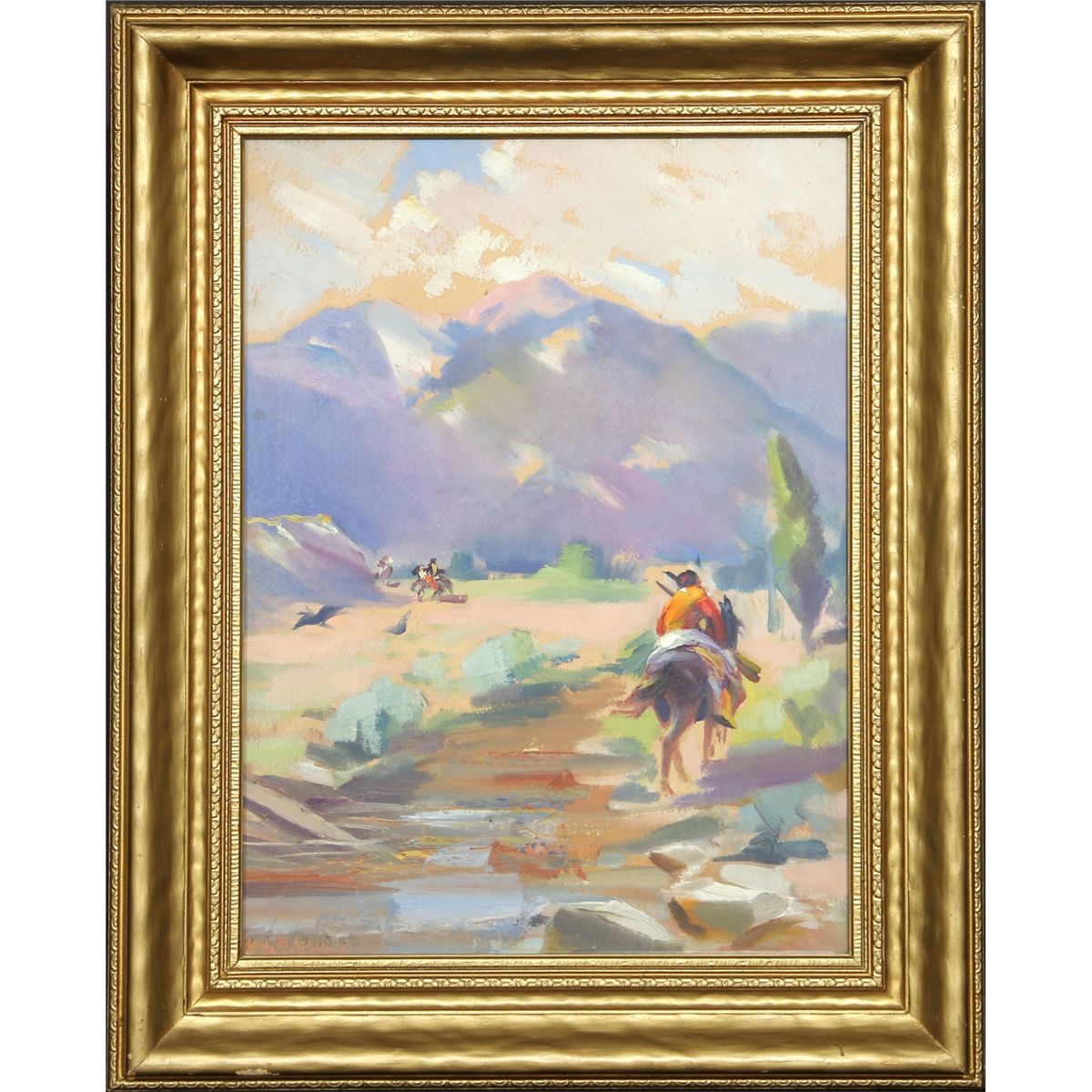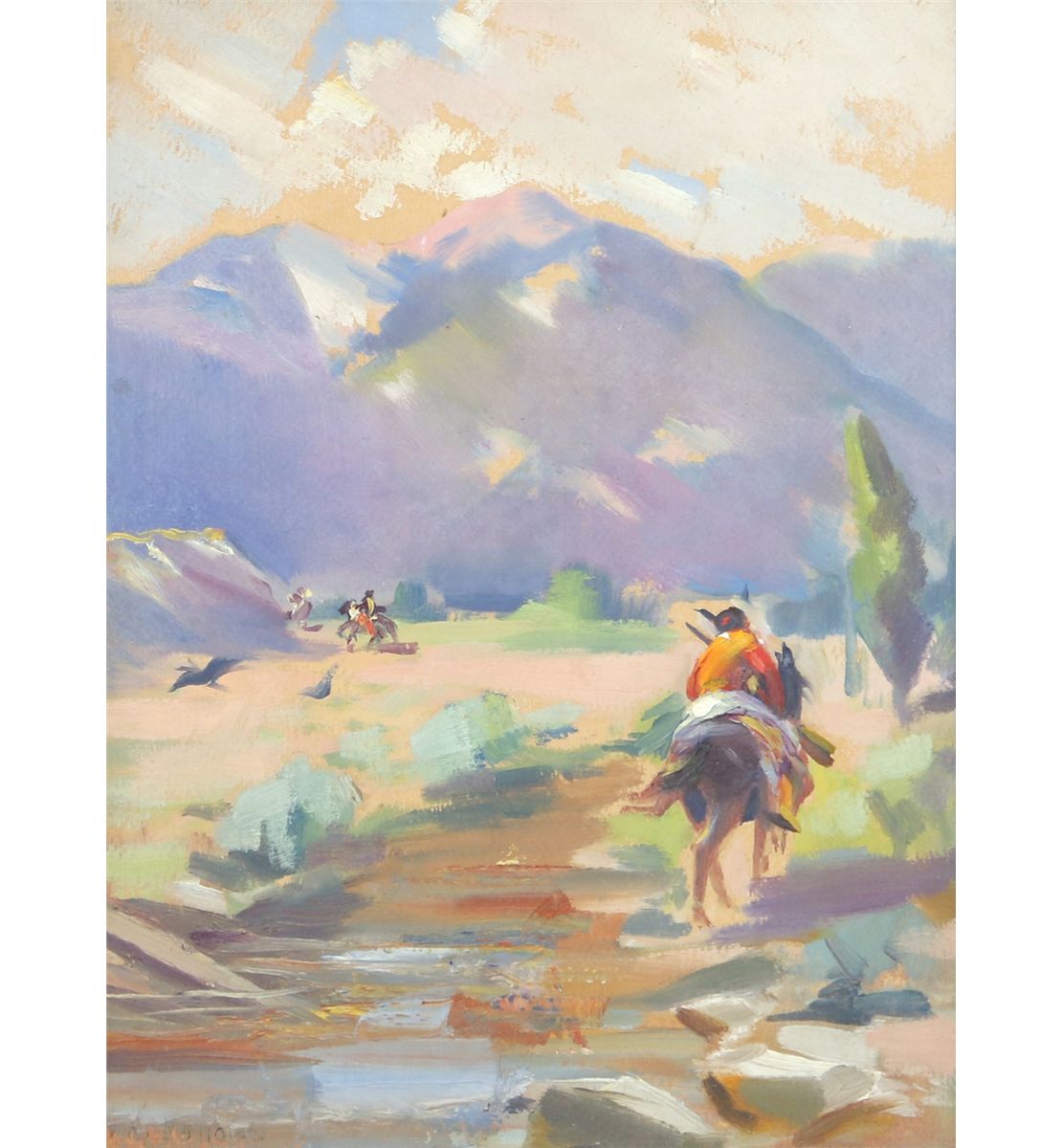 Julius Rolshoven (1858 - 1930). Summer Hunt. 15.75" x 11.75" oil on board. Signed lower left: J ROLSHOVEN. Verso: Julius Rolshoven.