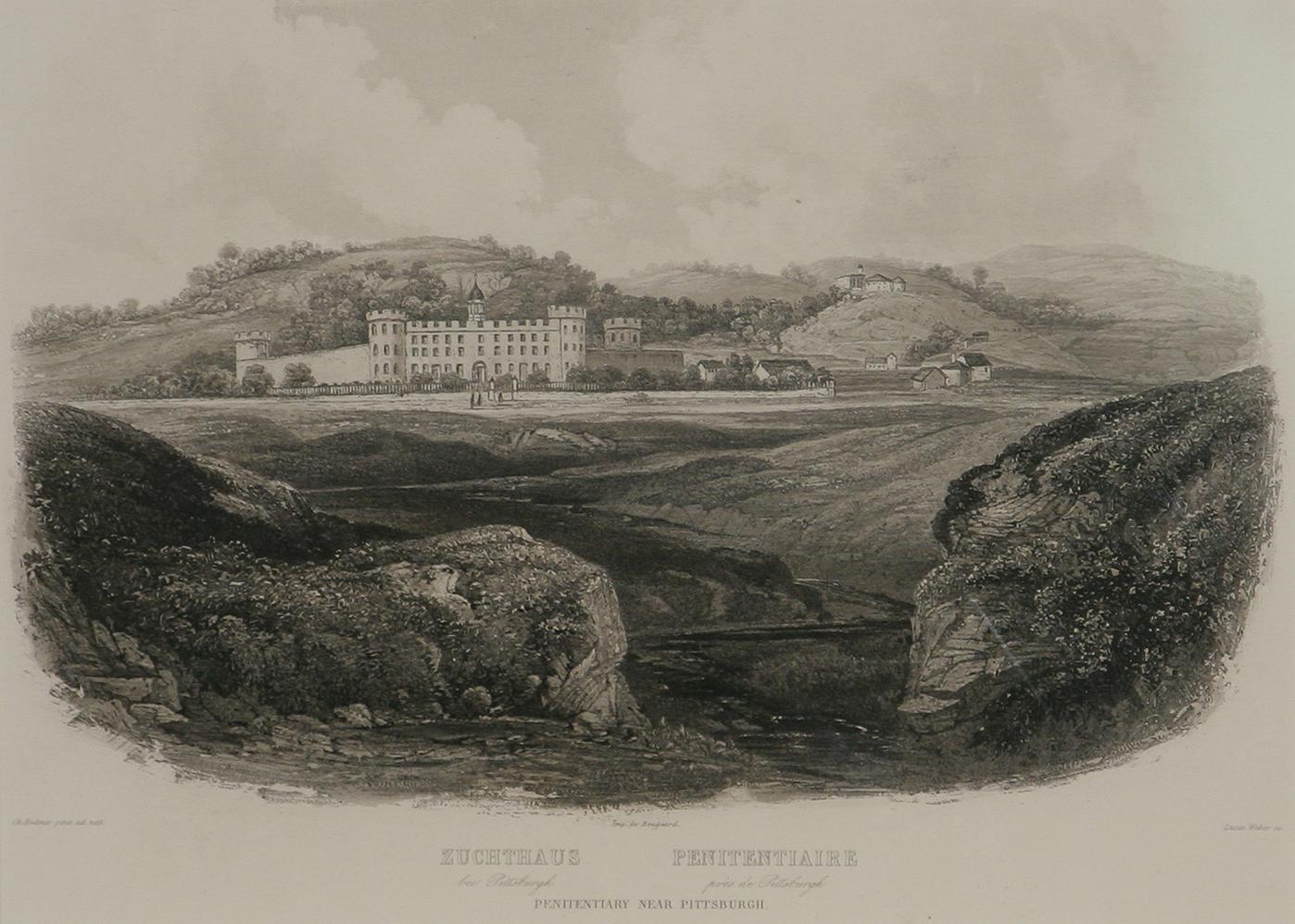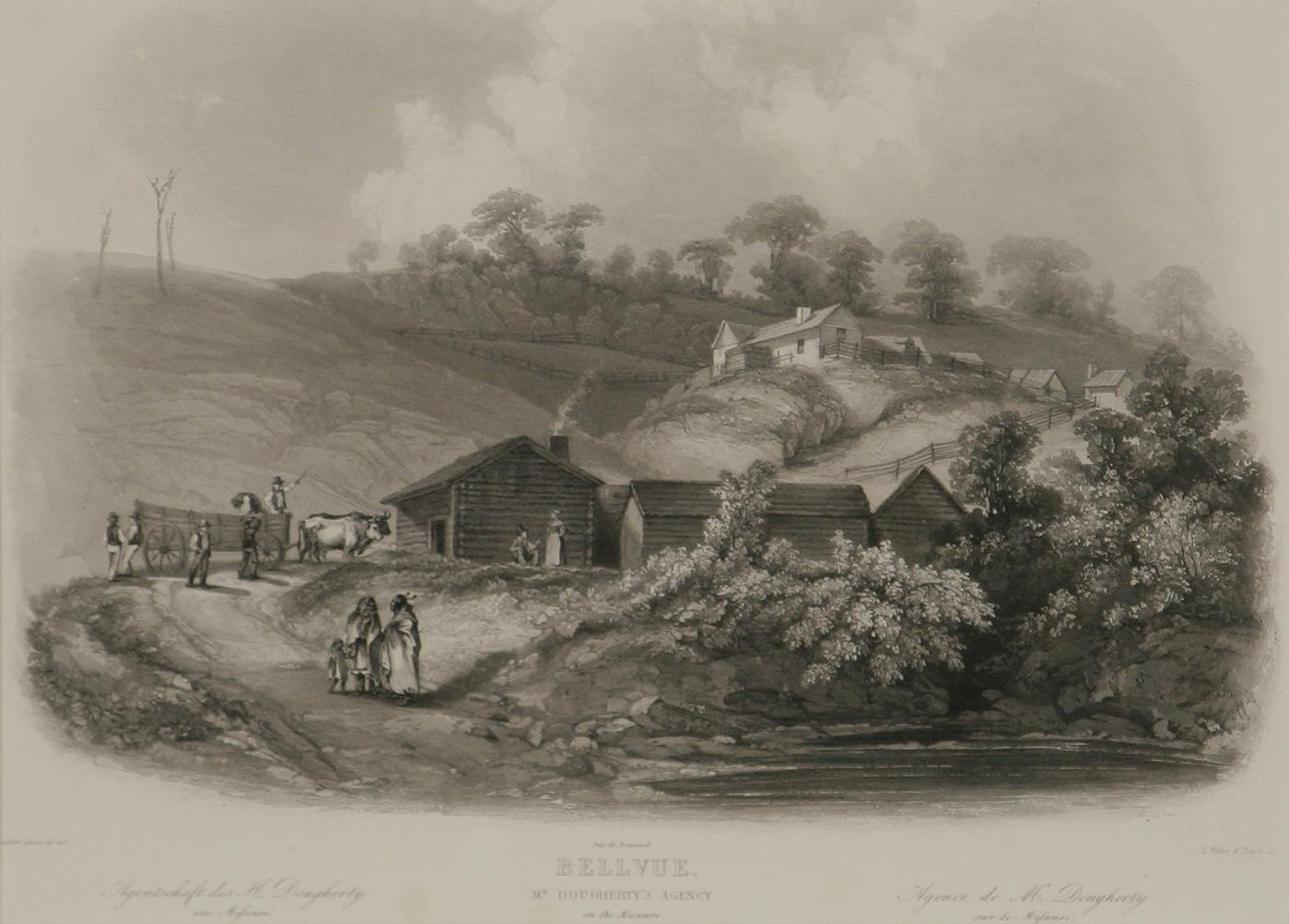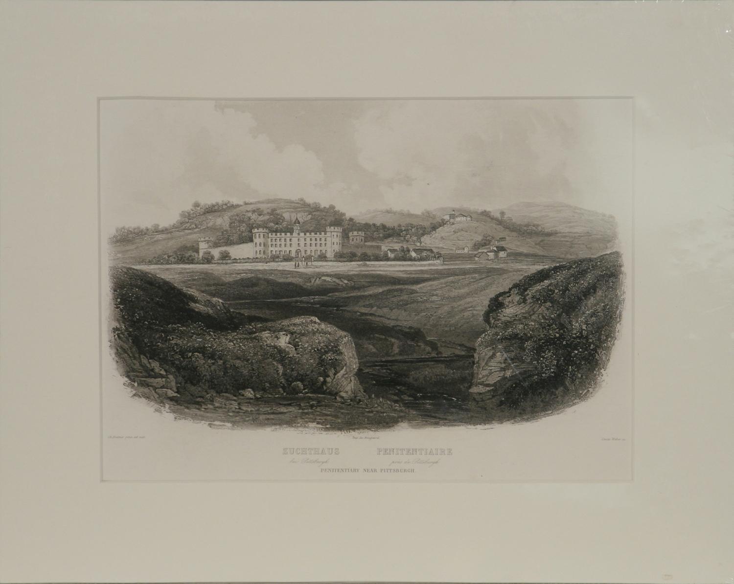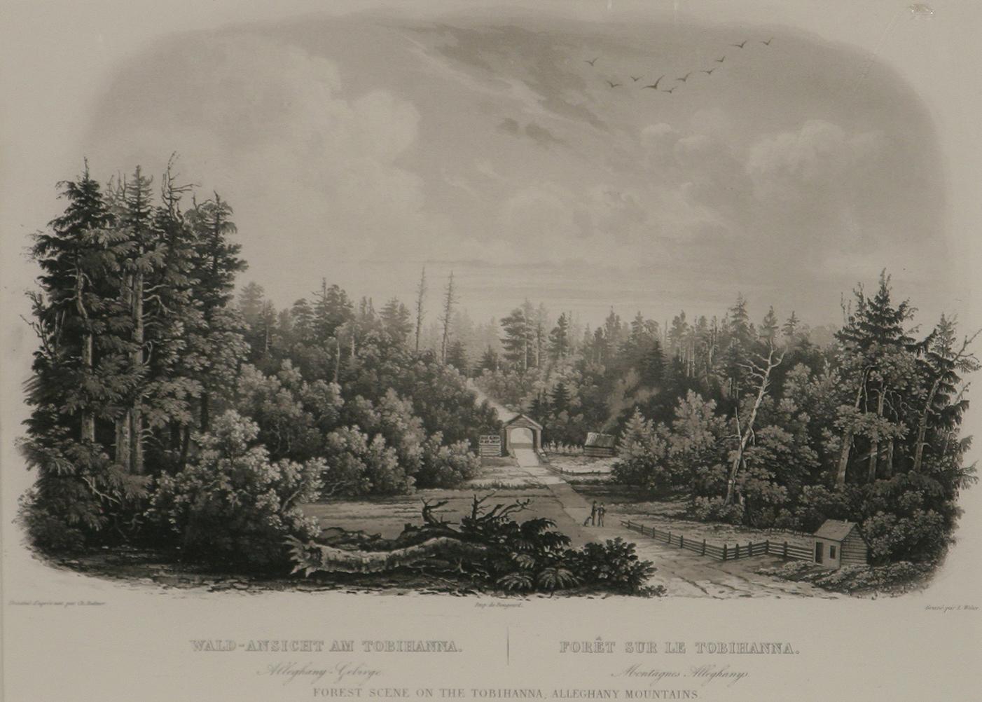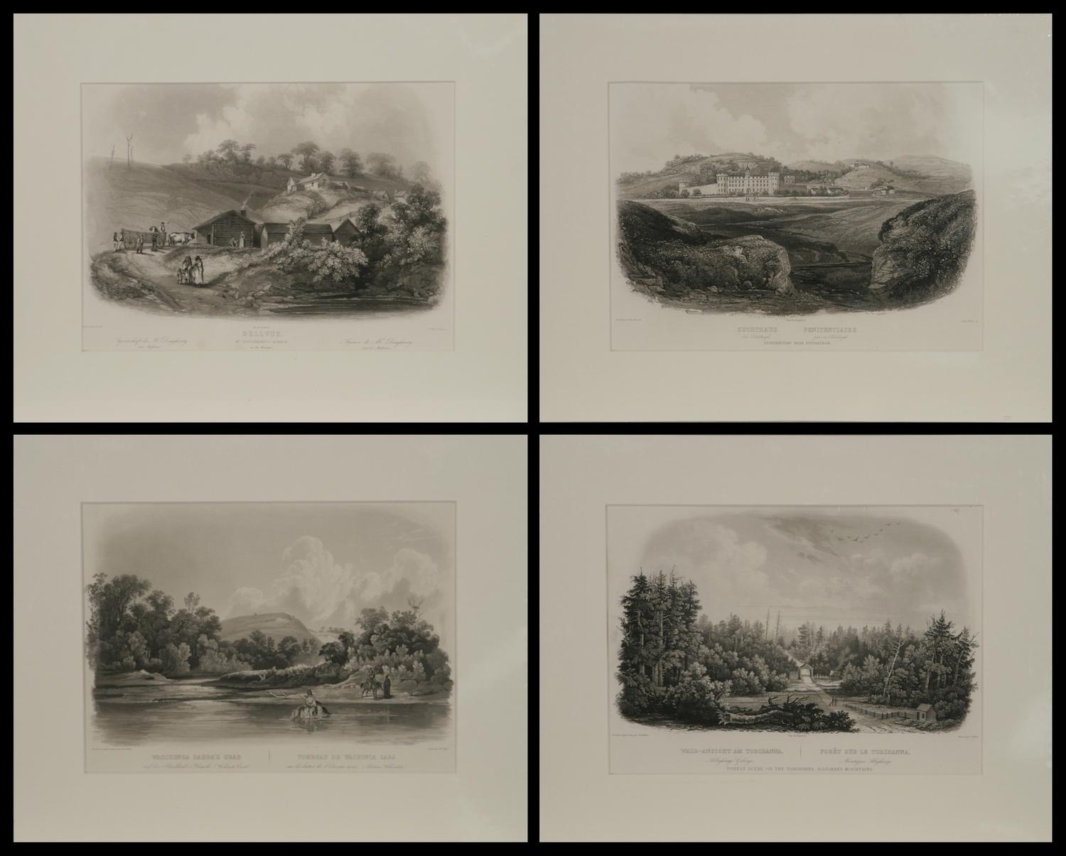 Karl Bodmer (1809-1893). Four aquatint etchings. (1) Forest Scene On The Tobihanna. (2) Waschunga Sahba's Grab On The Blackbird Hills. (3) Bellvue, McDougherty's Agency On The Missouri. (4) Penitentiary Near Pittsburgh. Each 8" x 10". After sketches/drawings by Karl Bodmer from Prince Maximilian's Travels in the Interior of North America. (est $3,000-5,000). Provenance: National Museum of Wildlife Art, Jackson, WY. Condition Report: All in excellent condition