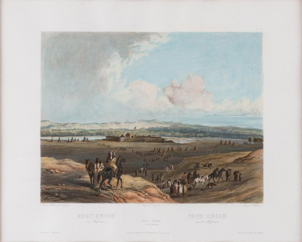 Karl Bodmer (1809-1893) Tableau 28. Fort Union on the Missouri 9.5" x 12.5" hand colored lithograph Published by Ackermann Co., 90 Strand. Blind stamp lower center. Arthus Berraud Edition. $4,000-5,000