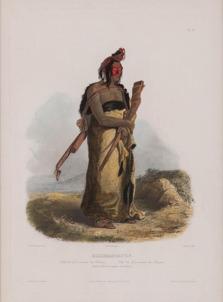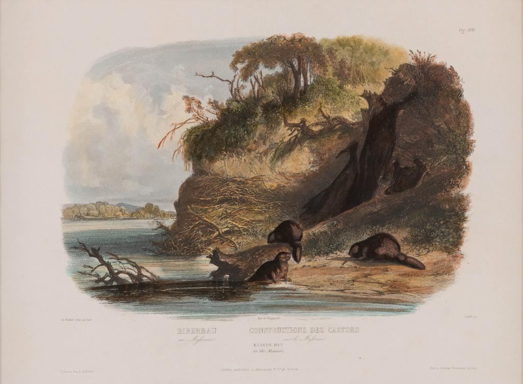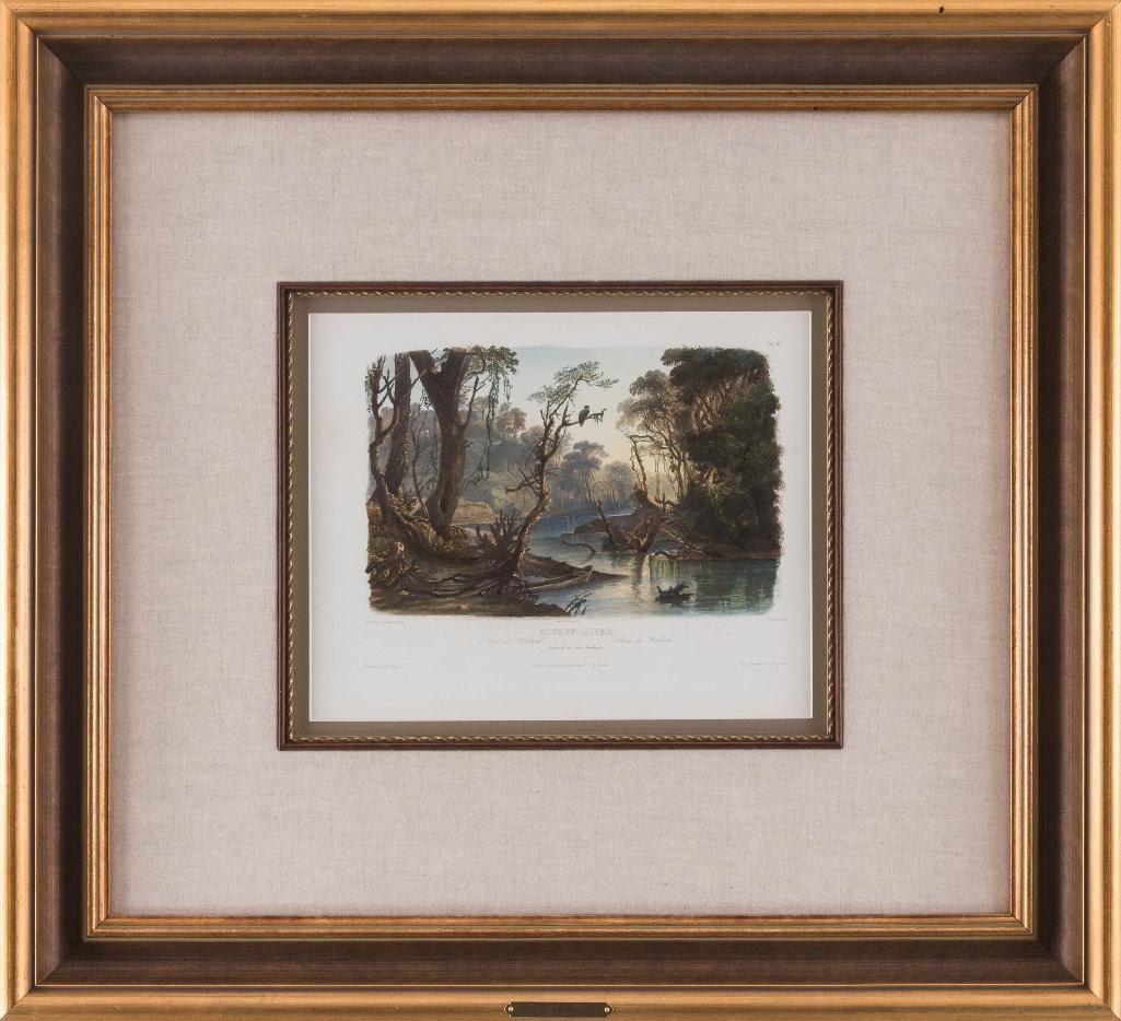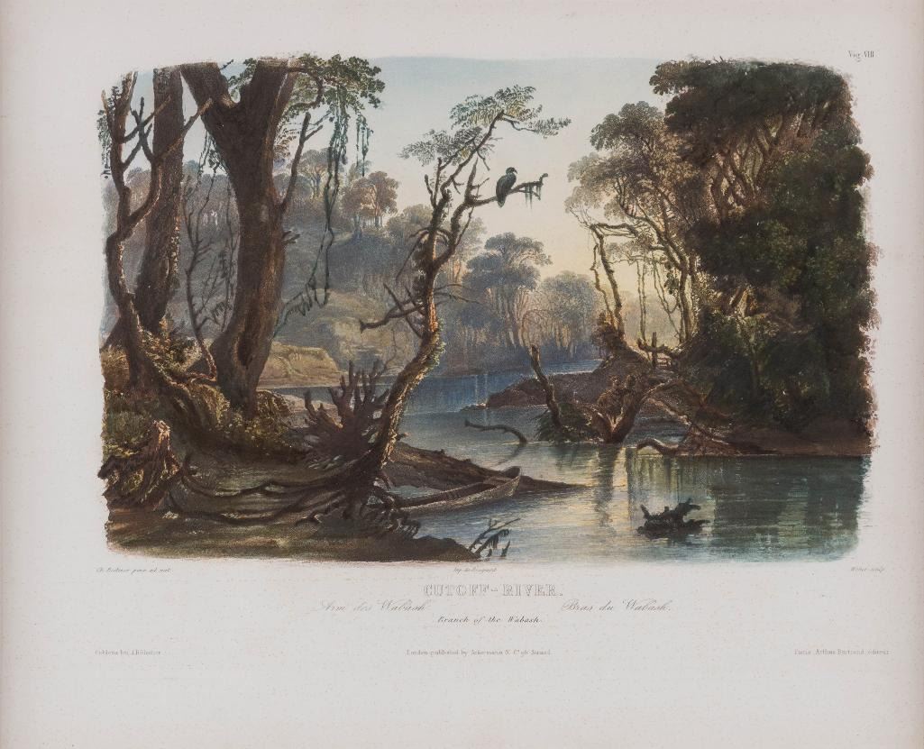 Karl Bodmer (1809-1893) Three Antique Prints: 1) Cutoff River, Branch of the Missouri 10" x 11.75". Vig. VIII. Blind stamp lower center. London, Published Ackermann Co. 96th Strand. Circa 1850. 2) Chief of the Gros Ventres 13" x 10". Vig. XX. Blind stamp lower center. London, Published Ackermann Co. 96th Strand. Circa 1850. 3) Beaver Hut- On the Missouri 9.5" x 13". Vig. XVII. Blind stamp lower center. London, Published Ackermann & Co. 96th Strand. Circa 1850. $2,000-3,000