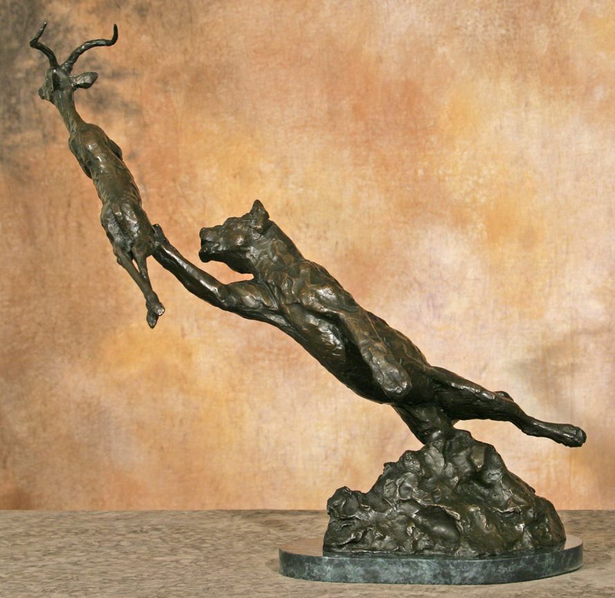 Kenneth Bunn (1938 - ). Lioness & Impala. 22" x 26" x 14" bronze. Inscribed: © Bunn 9/21. Condition reports can be viewed at www.marchinmontana.com/docs/2013CR.pdf