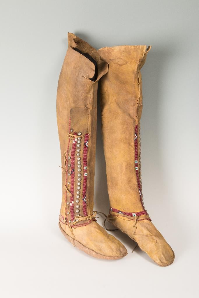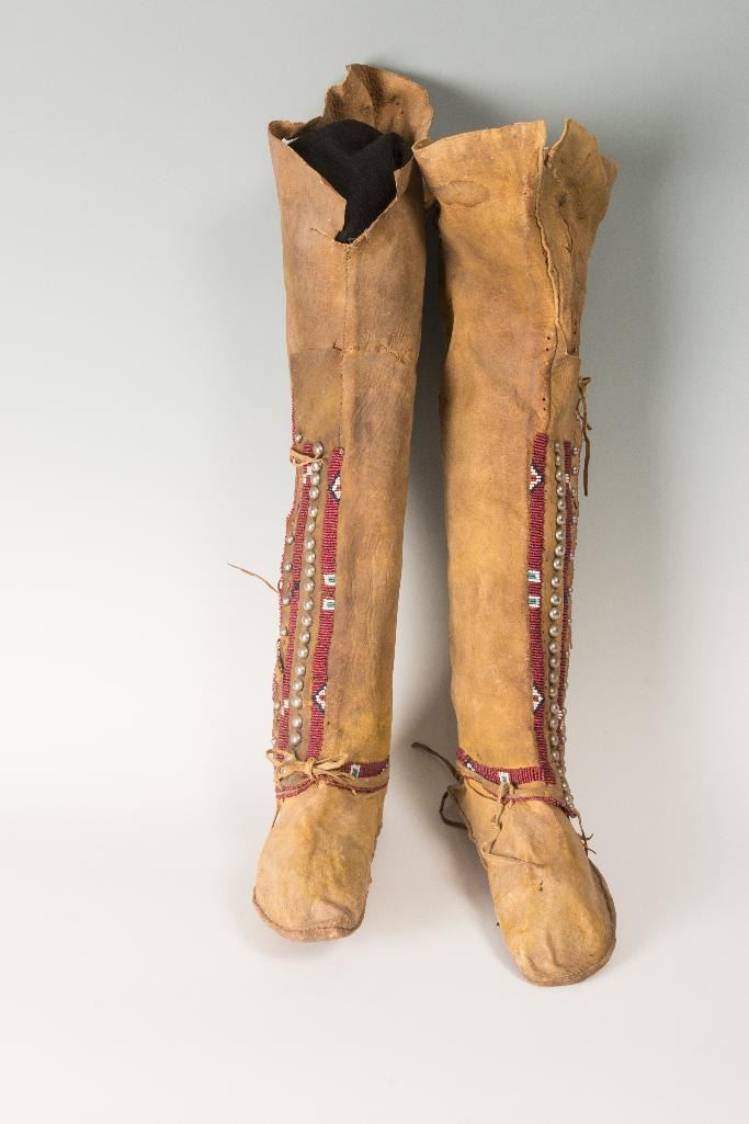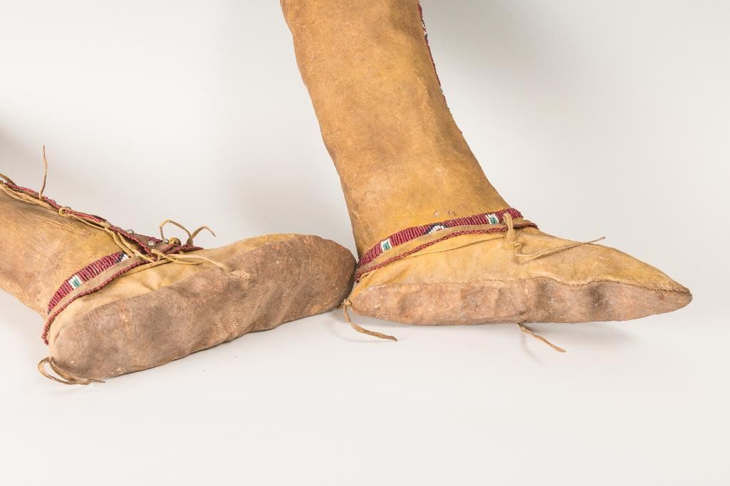 Kiowa Beaded Hightop Man's Moccasins 10.5" long, 21" tall. Decorated with silver tacks on yellow ochred hide. 19th century. $1,500-2,500 Provenance: Ex Bokelman Collection.