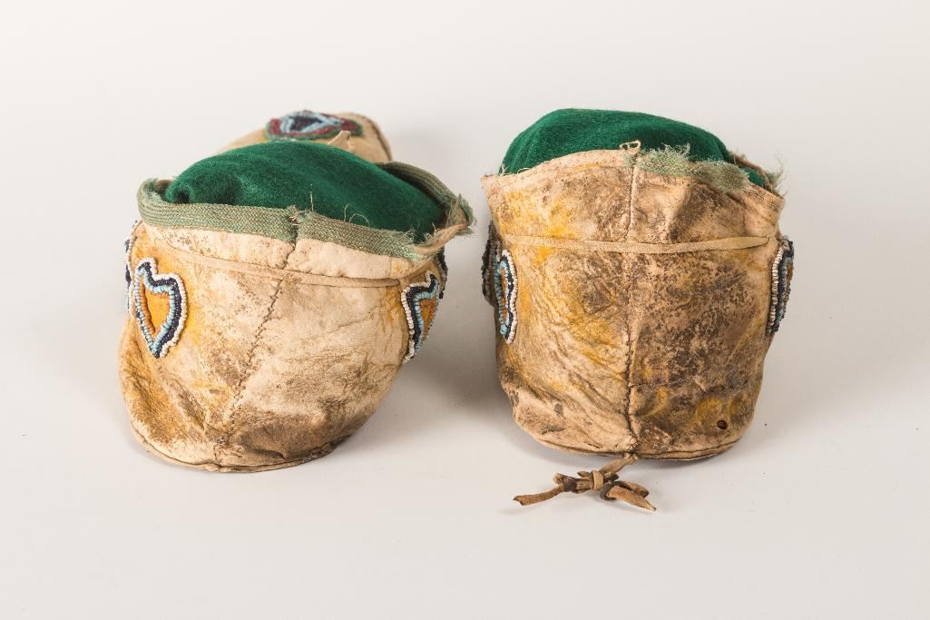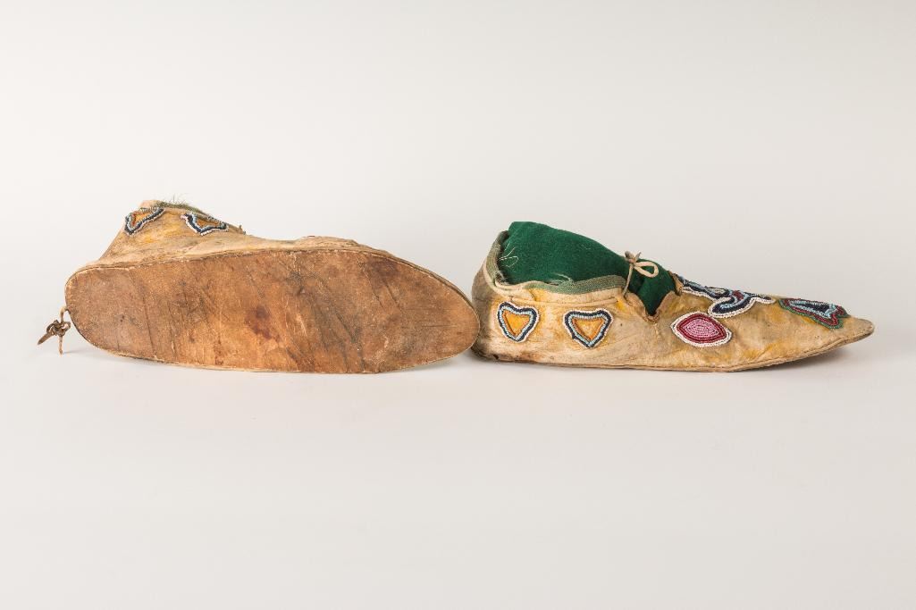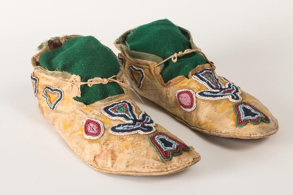 Kiowa Beaded Man's Moccasins 9.5" long with thunderbird designs and remnants of yellow ochre. 19th century. $1,500-2,500