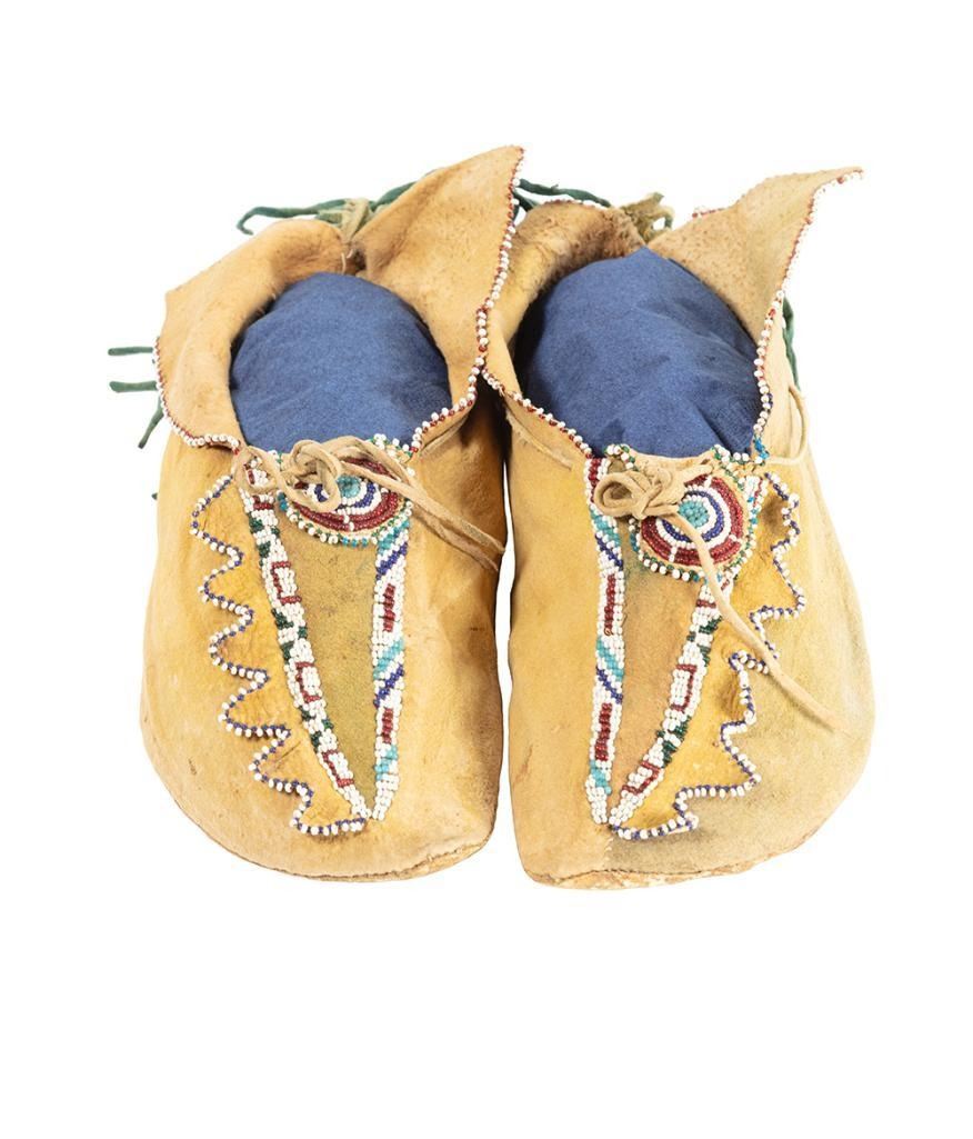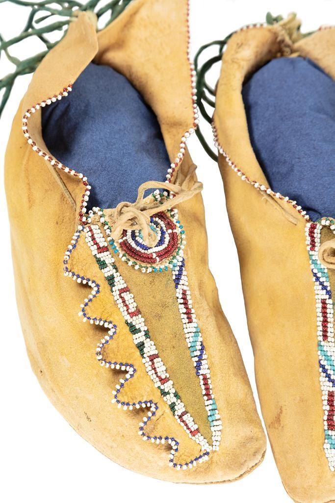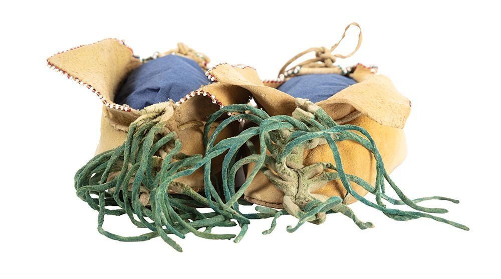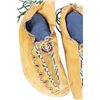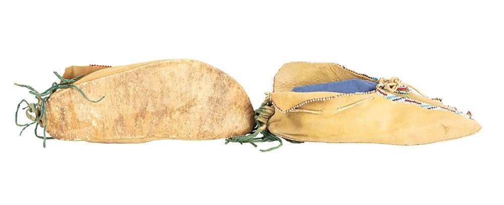 9.5" delicately beaded with a scalloped design, a medallion, "lace" beading along cuffs and a duster heel dyed with green ochre. Circa 1890.