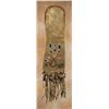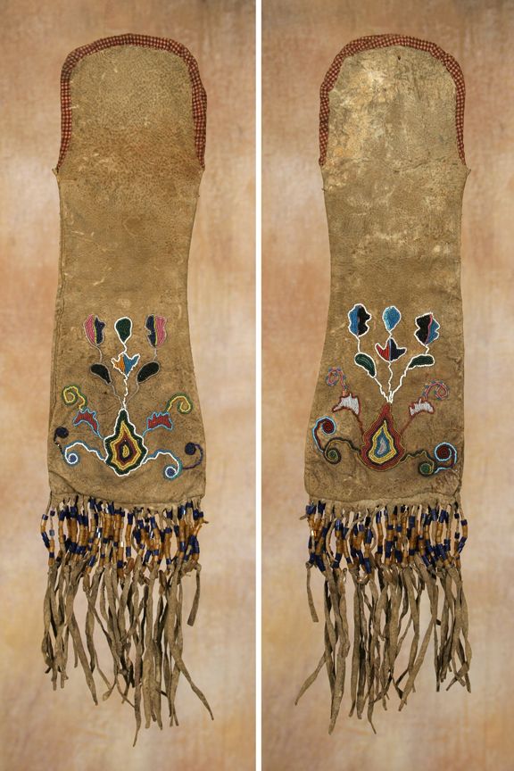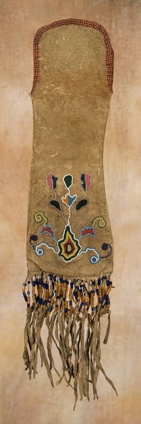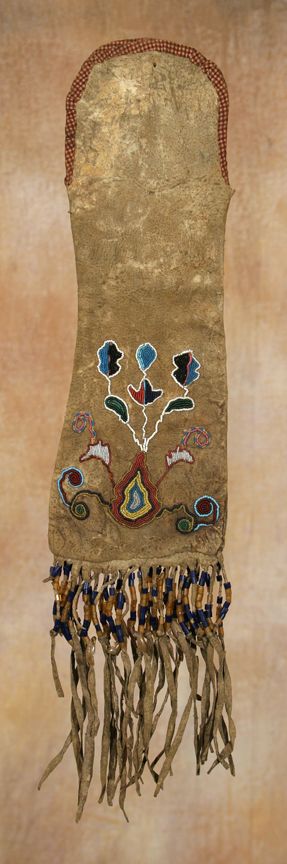 Kiowa Pipebag. 5.25" x 18" including fringe. Differing floral designs in a multitude of tiny colored beads. Large cobalt & yellow glass beads at the top of the tassels. Cloth lined. Circa 1860. Condition reports can be viewed at www.marchinmontana.com/docs/2013CR.pdf