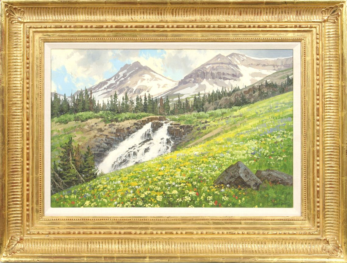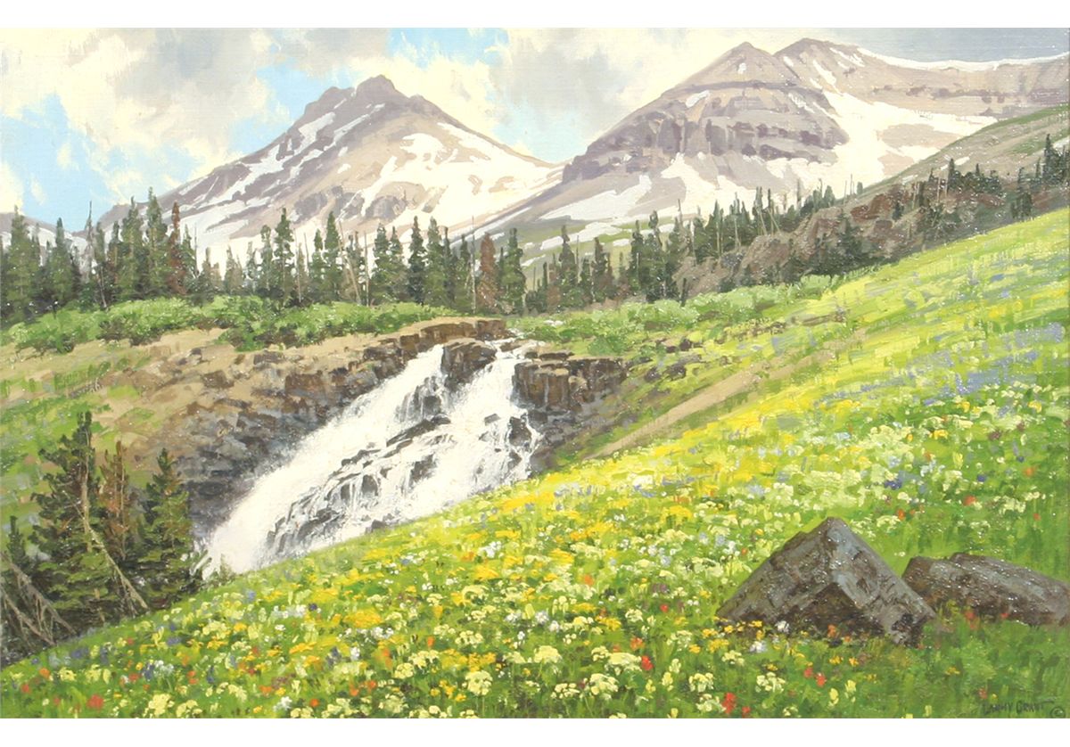 Lanny Grant (1953 - ). Yankee Boy Basin. 16" x 24" oil on board. Signed lower right: LANNY GRANT ©. Dated 1997 verso. Provenance: Zoo Montana, Billings, MT. Condition reports can be viewed at www.marchinmontana.com/docs/2013CR.pdf