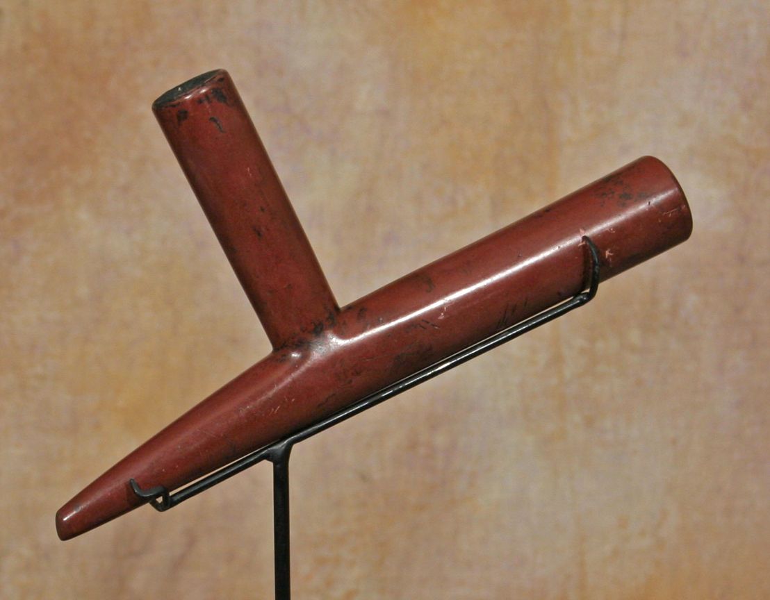 Large T-Style Pipe Bowl. 12" long, 6" tall cylindrical catlinite pipe bowl with tapering prow. 19th century. Condition reports can be viewed at www.marchinmontana.com/docs/2013CR.pdf