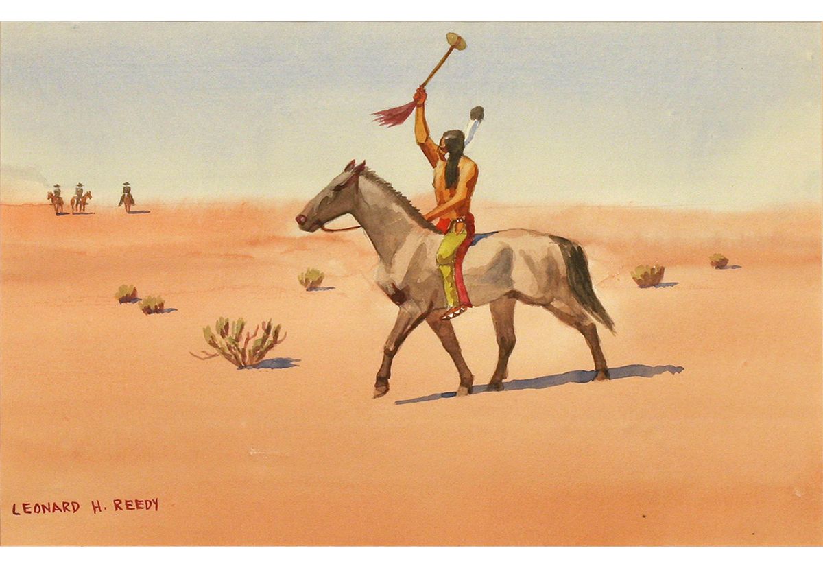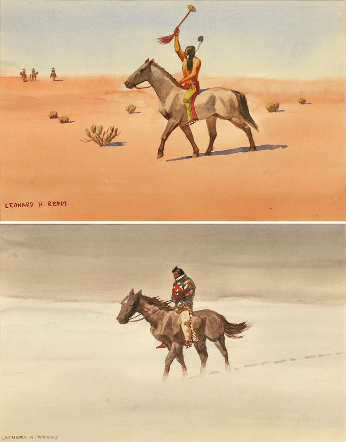 Leonard Reedy (1899 - 1956). The Signal & Winter Rider. Two 8.5" x 11" watercolors. Both signed lower left: LEONARD H. REEDY. Condition reports can be viewed at www.marchinmontana.com/docs/2013CR.pdf