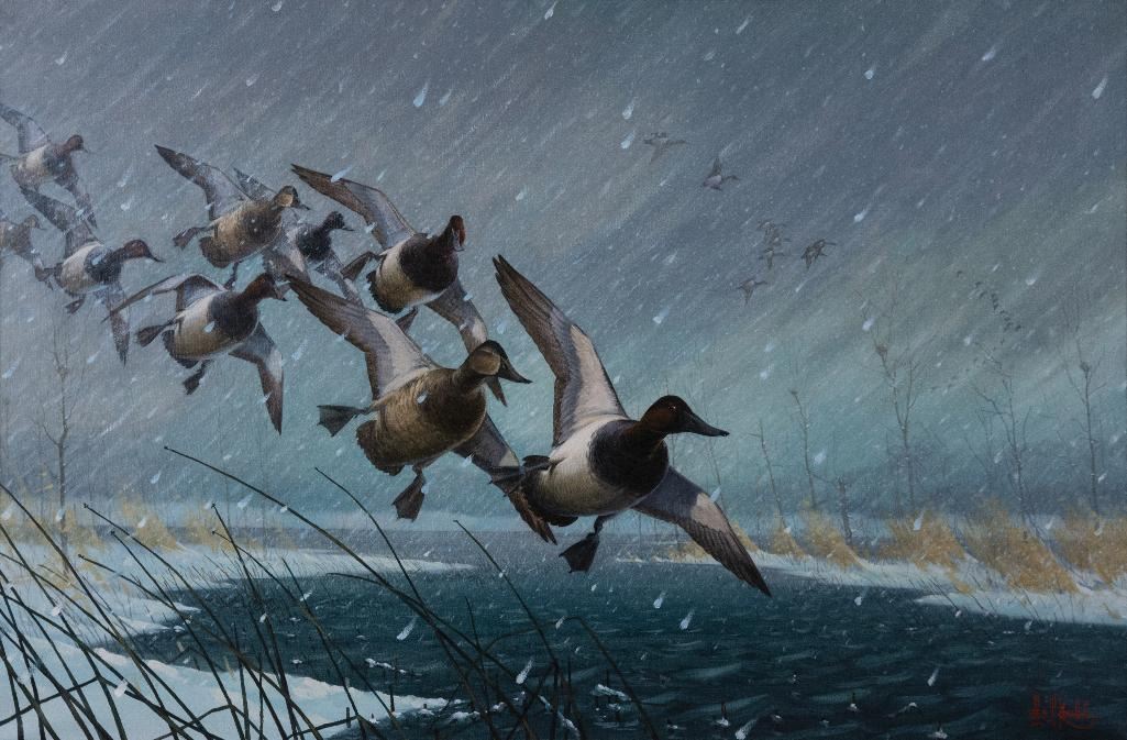Les Kouba (1917-1998) Late Canvasbacks 23.5" x 35.5" oil on canvas Signed lower right $1,500-2,500