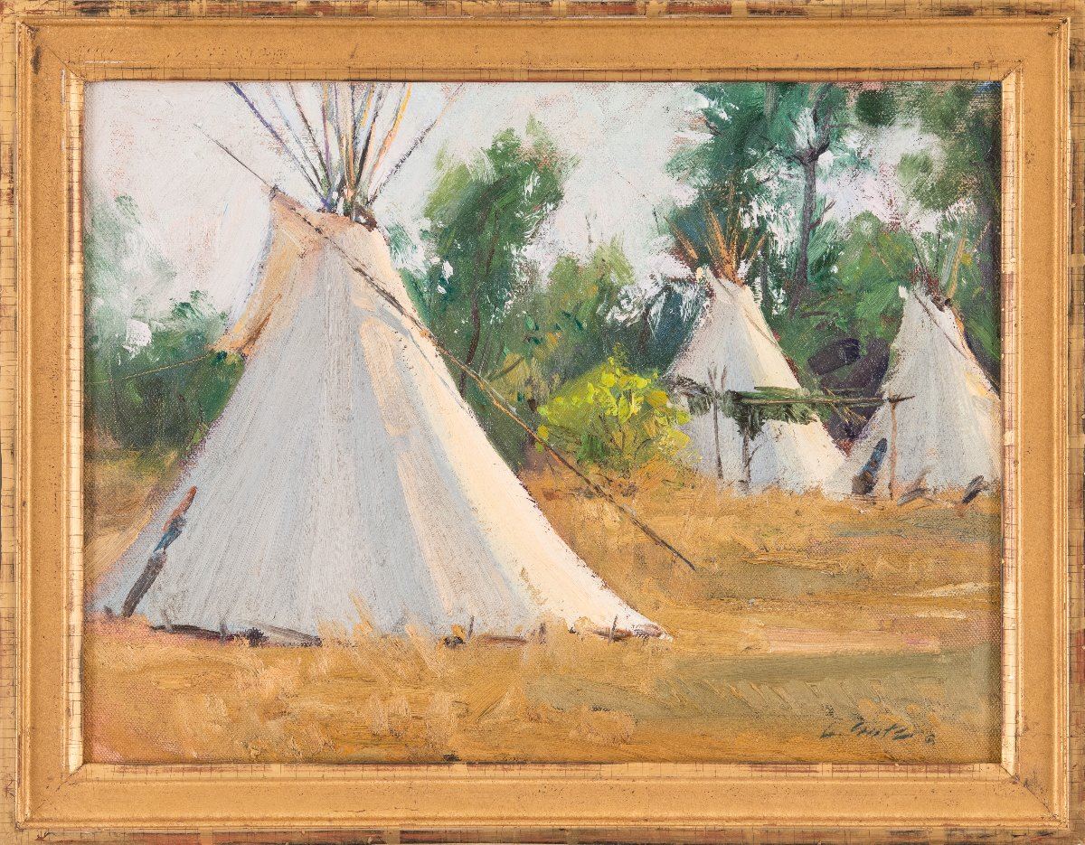 Loren Entz (1949 - )(CA). Indian Camp. 12" x 16" oil on canvas. Signed lower right, CA.