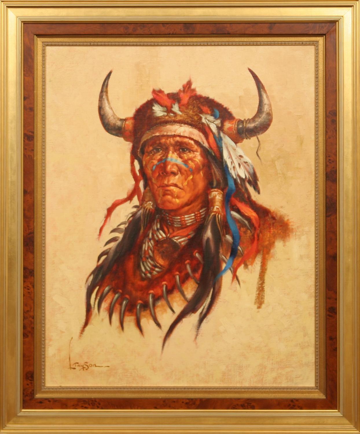 Lyle Tayson, Sr. (b. 1924). Kiowa Leader. 28" x 22" oil on canvas. signed lower left. (est $1,000-2,000) Condition Report: Black lights clean