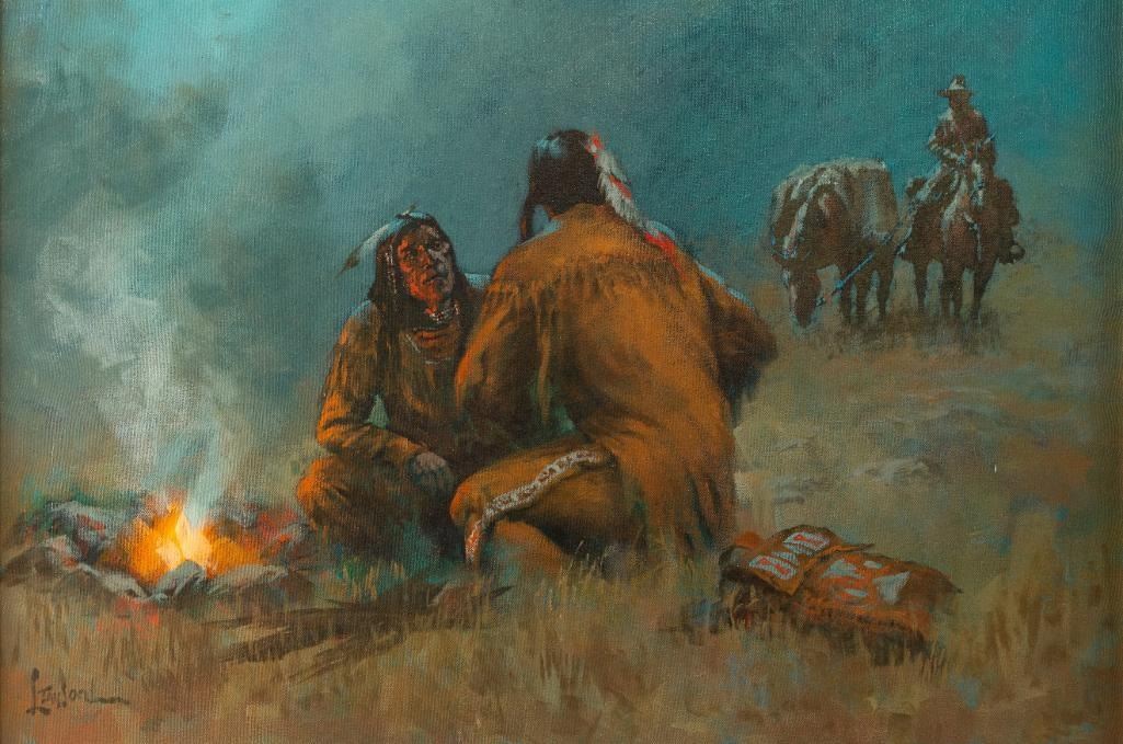Lyle Tayson (1924-2014) Pow Wow 26" x 37" oil on canvas Signed lower left $3,000-5,000 Provenance: Private Collection, St. Regis, MT.