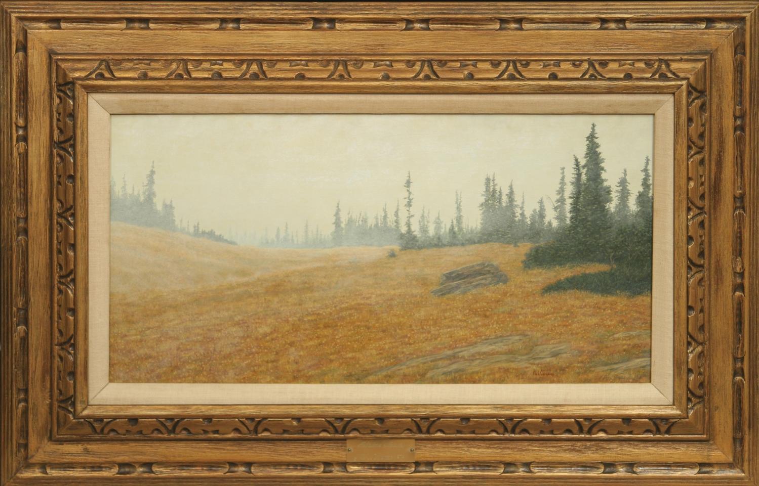 M. L. Coleman (20th century). Alpine Mists. 12" x 24" oil on board. signed lower right. dated 1974 on back. (est $600-900) Condition Report: Black lights clean and nicely framed