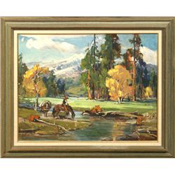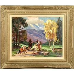 Marjorie Reed (1915 - 1996). Pack Train. 16" x 20" oil on canvas. Signed lower right: MARJORIE REED. Provenance: Purchased directly from ...