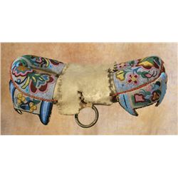 Blackfeet Pony Saddle. 14 ½" x 9" Pad saddle with intricate beaded floral designs in a variety of solid and translucent colored beads...