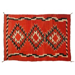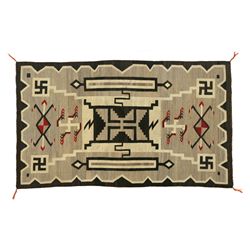 Navajo Weaving. 5'2" x 3'. J. B. Moore pattern. Crystal Storm design with six whirling logs and two water bugs. Natural colors with red...