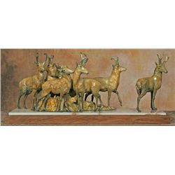 Sherry Sander (1941 - ). Antelope At Ingomar. 13" x 31" x 7.5" bronze on marble & wood base. Inscribed: S SANDER © 89 18/35....