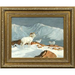 Greg Beecham (1954 - ). Bighorn Sheep. 22" x 40" oil on canvas. Signed lower right: G. BEECHAM © 1989 . Condition reports can be ...