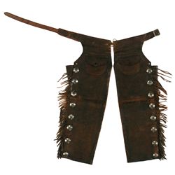 R. T. Frazier (Pueblo, CO.) Chaps. Early pair of chaps with sixteen nickel conchos & fringed edges. Maker-marked on billet. Condition report...