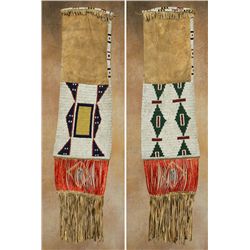 Lakota Pipebag. 18" x 6" with 9" fringe. Beaded geometric designs on panels, different on each side. Three lanes of beadwork continue...
