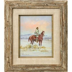 Ace Powell (1912 - 1978). Winter Rider. 10" x 8" oil on canvas. Signed lower left: [ace card] POWELL. Condition reports can be viewed a...